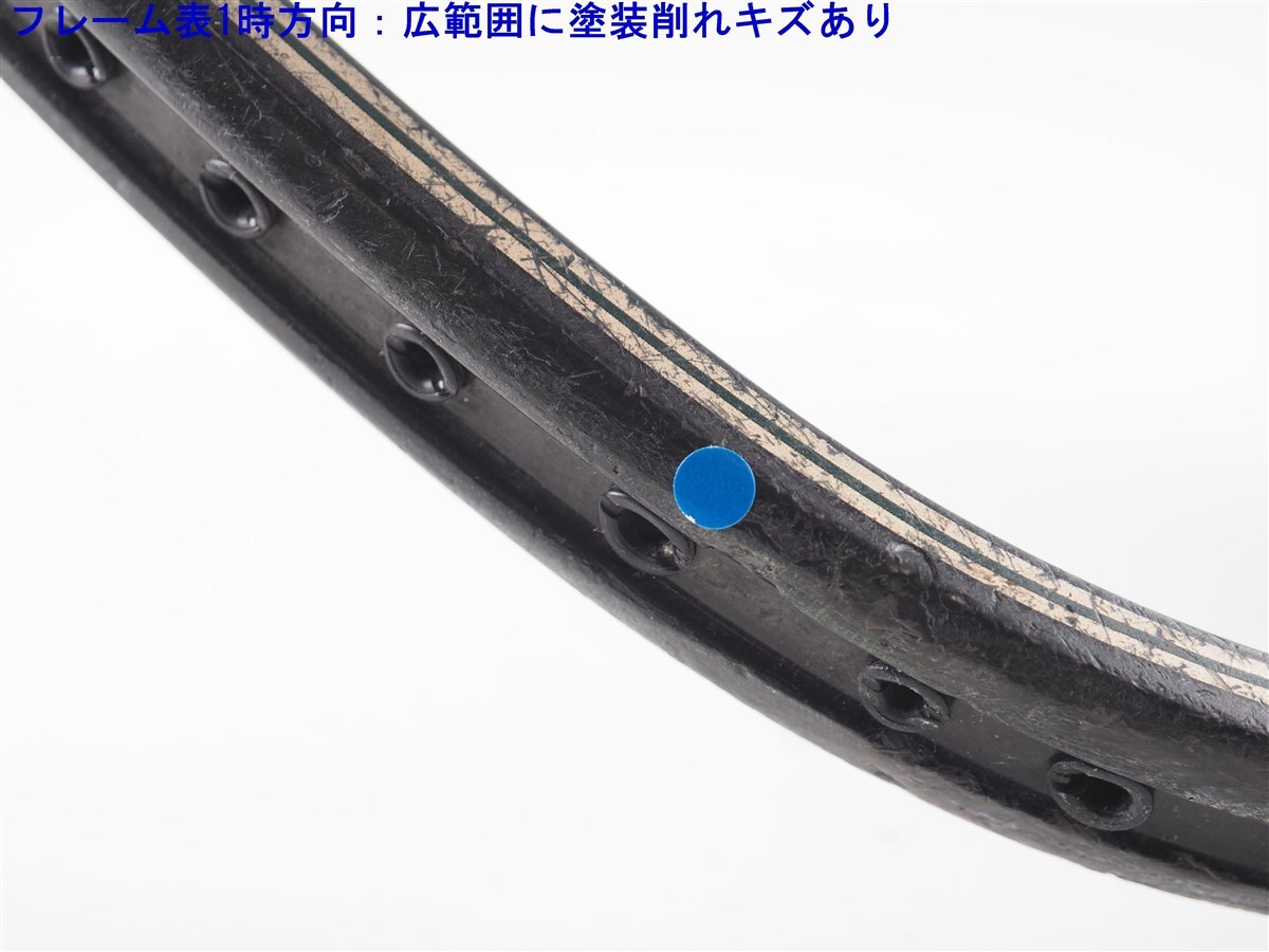 フレームは両面とも全体的にかなり激しく傷んでいて、広範囲に渡って表面の塗装が削られてる箇所が多くあります。塗装が剥げて下地が出ておりますのでキズも目立ち、使用感もかなりあります。ラケットの状態やキズが気になる方にはオススメできません。