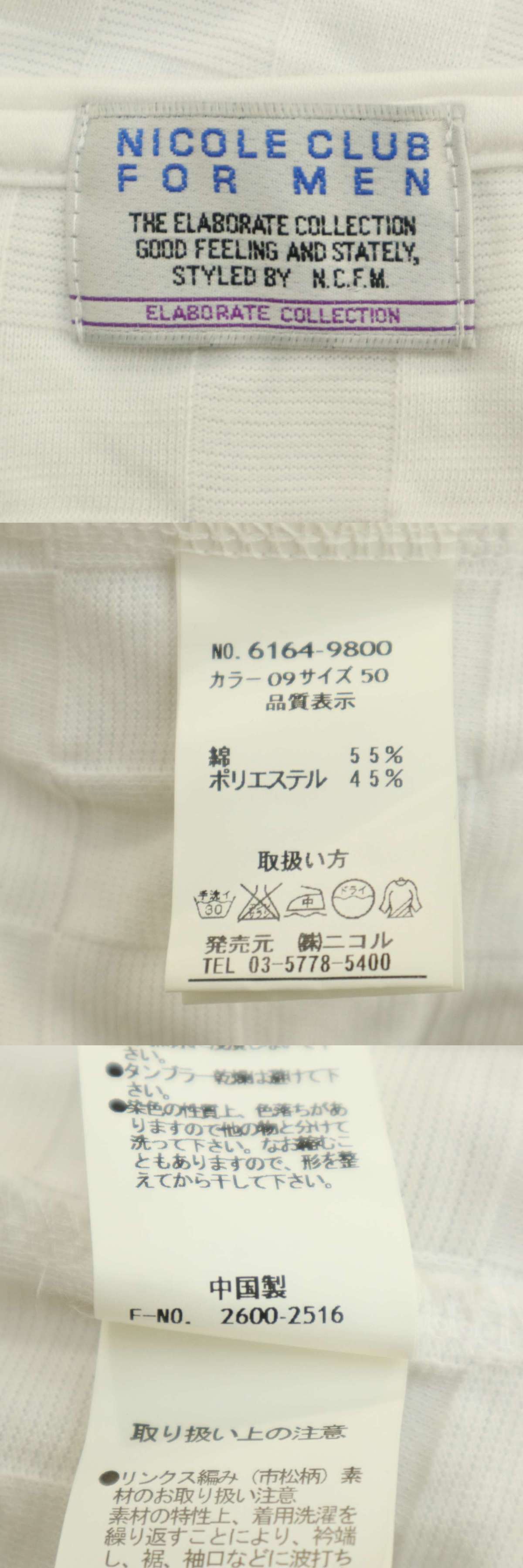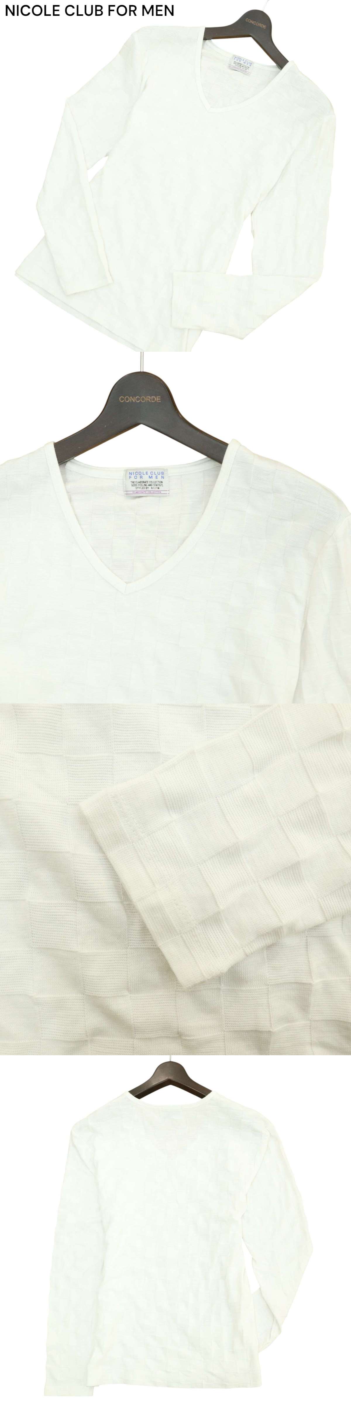 NICOLE CLUB FOR MEN ニコルクラブ フォーメン 格子柄★ 長袖 Vネック チェック カットソー ロンTシャツ Sz.50 メンズ 白