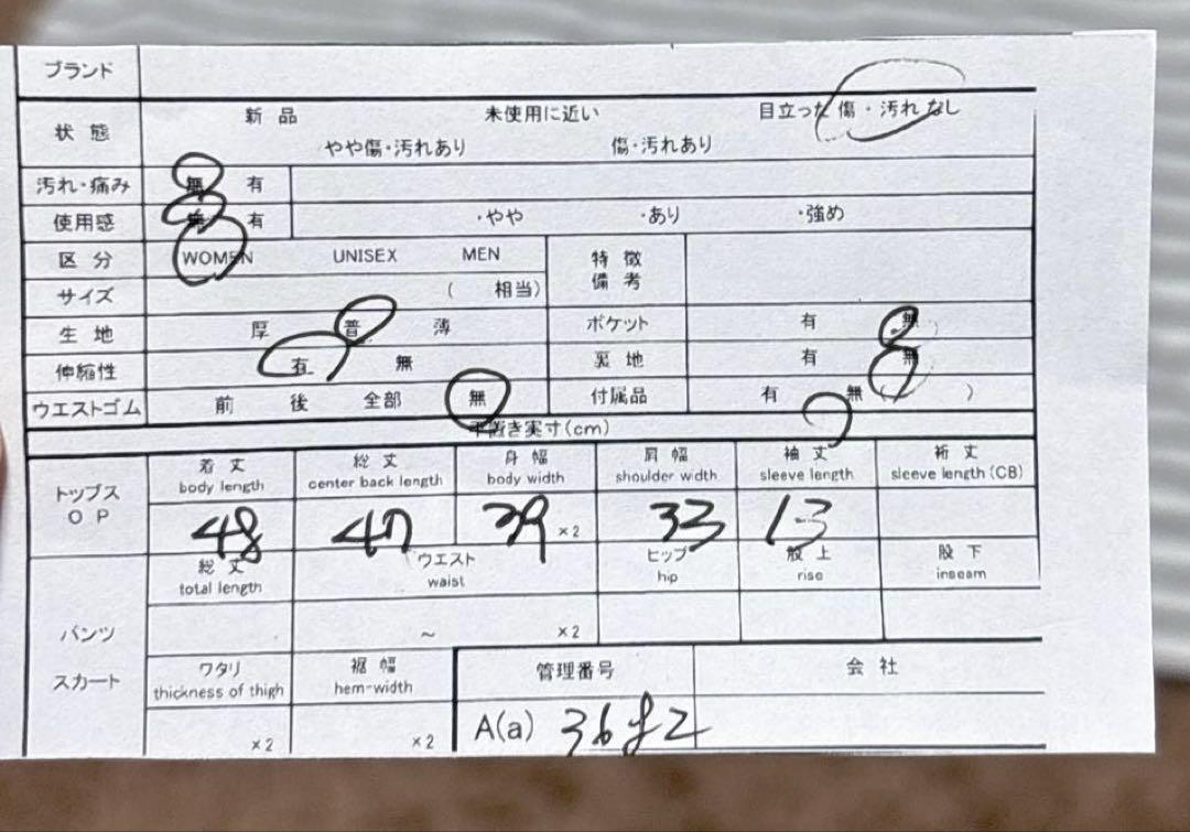 ※アパレルのブランドによりサイズ基準が異なるので、必ず採寸表をご確認の上、ご購入お願いいたします