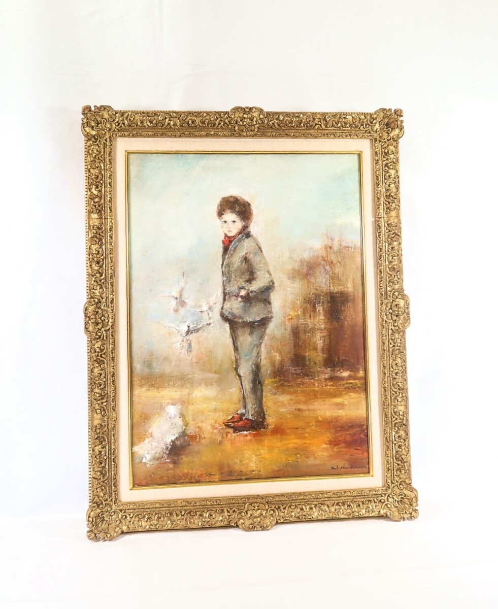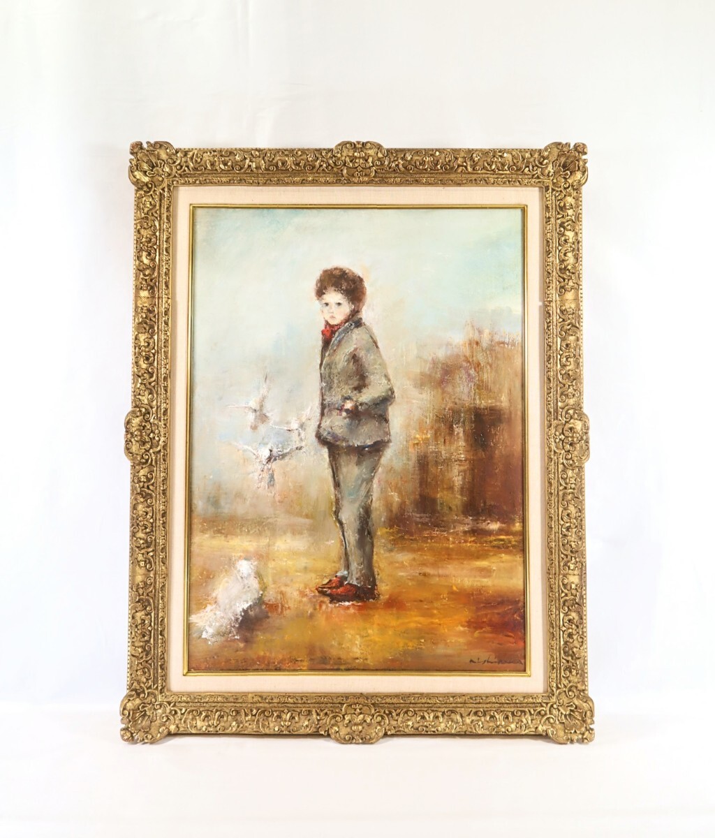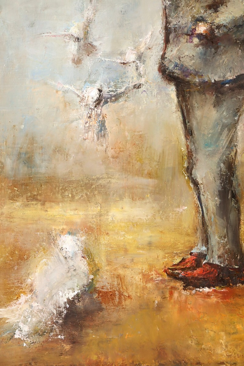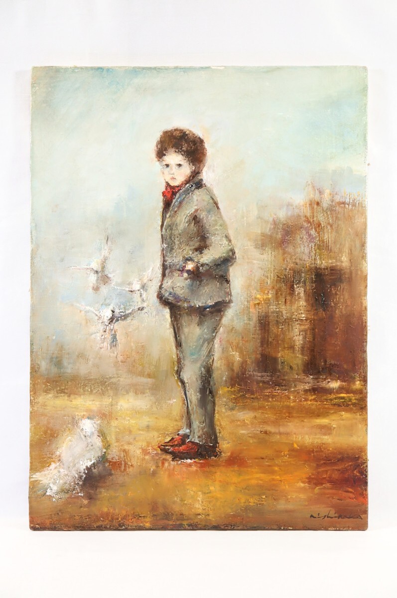 真作 西中博 大作油彩「鳩と少年」画寸 P20 大分県出身 自由美術協会会員 内なる力を画布に叩きつけた様な画面に理性的な思考の痕跡 11155
