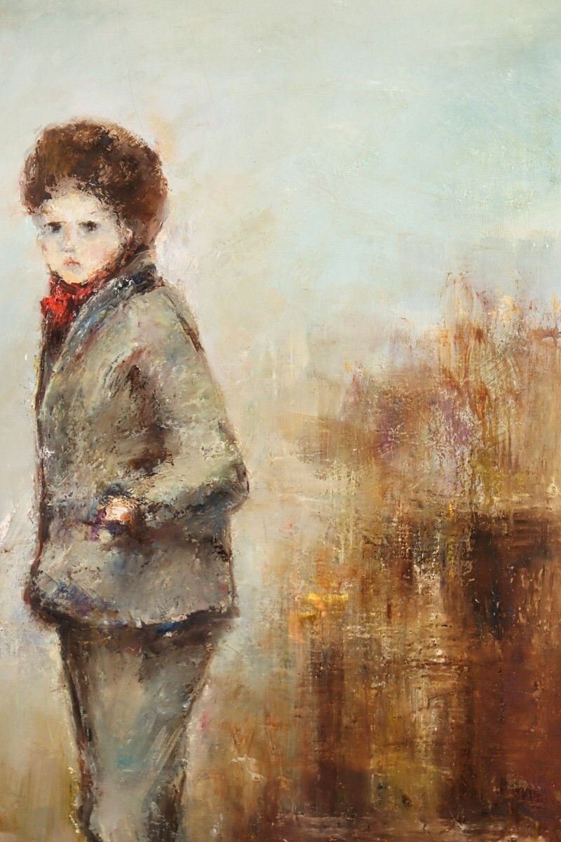 背景は抽象的でありながらも、少年と鳩の存在感を際立たせて、