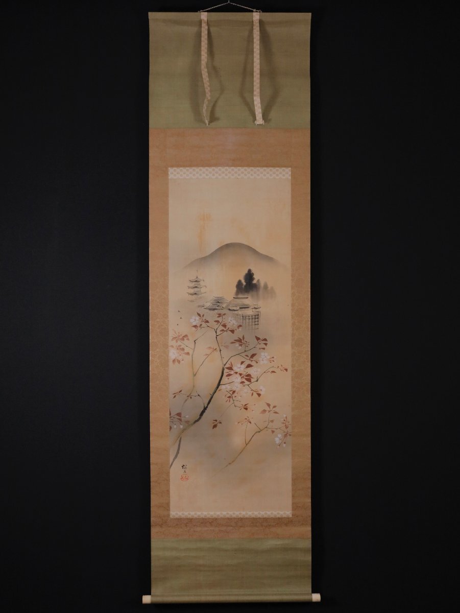 【模写】吉】12628 木島桜谷 桜 清水寺図 四条派 茶掛け 茶道具 掛軸 掛け軸 骨董品