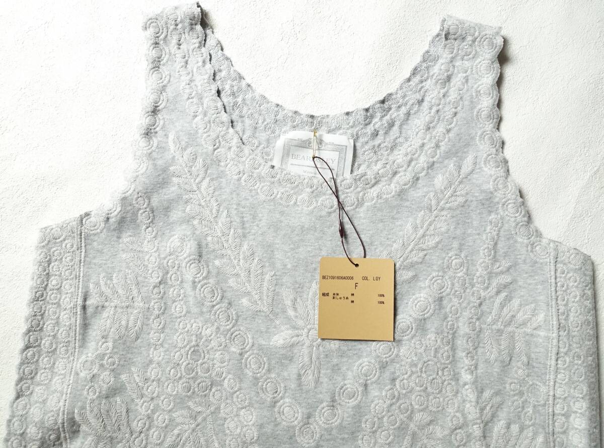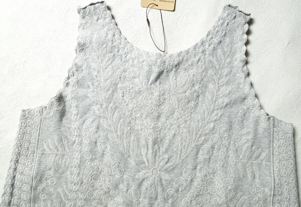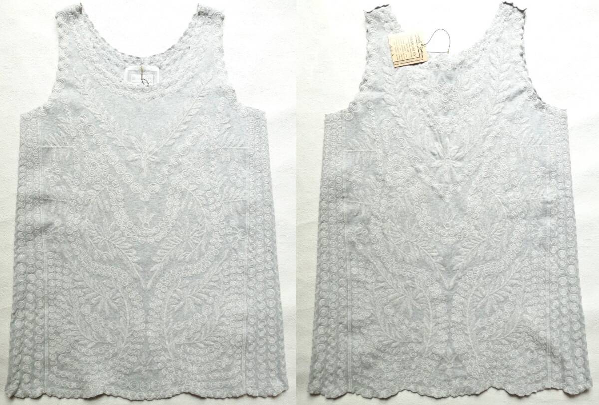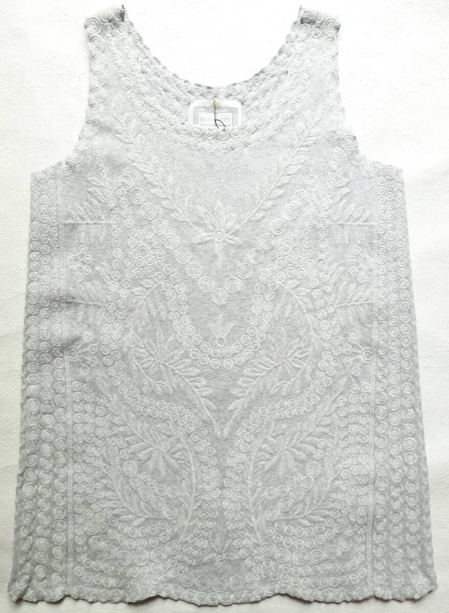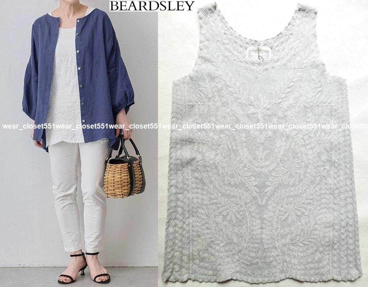 オリジナルの刺繍を全面贅沢に使用した、BEARDSLEY定番の刺繍タンク。2019S/Sの定価19800円。裾や袖口にはスカラップレースのように刺繍を施しカットしています。お尻が隠れる安心して着ていただける着丈と、透け感も気にならない程よい厚み。刺繍が施されているのに柔らかい着心地。カーディガンやジャケットのインナーにも最適。