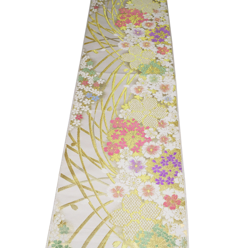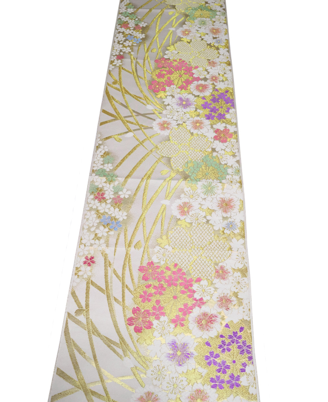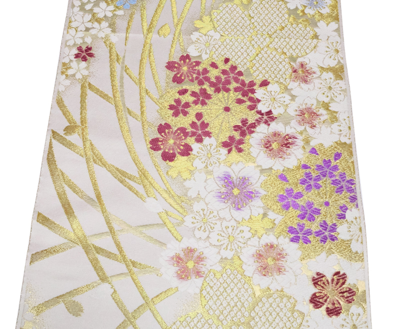 正絹 新古品の帯地用サンプル端切れです。 白に近い生成りの地色に網目と桜づくしの花模様が織り込まれています。 金糸や色糸が使われています。 サイズは幅が約33,2cm、長さが約140cmです。 訳ありです。 下からやく4cmのところ、左耳からやく6cmの所に縦に1,2cm程の1本の 線が誤って書き込まれています。