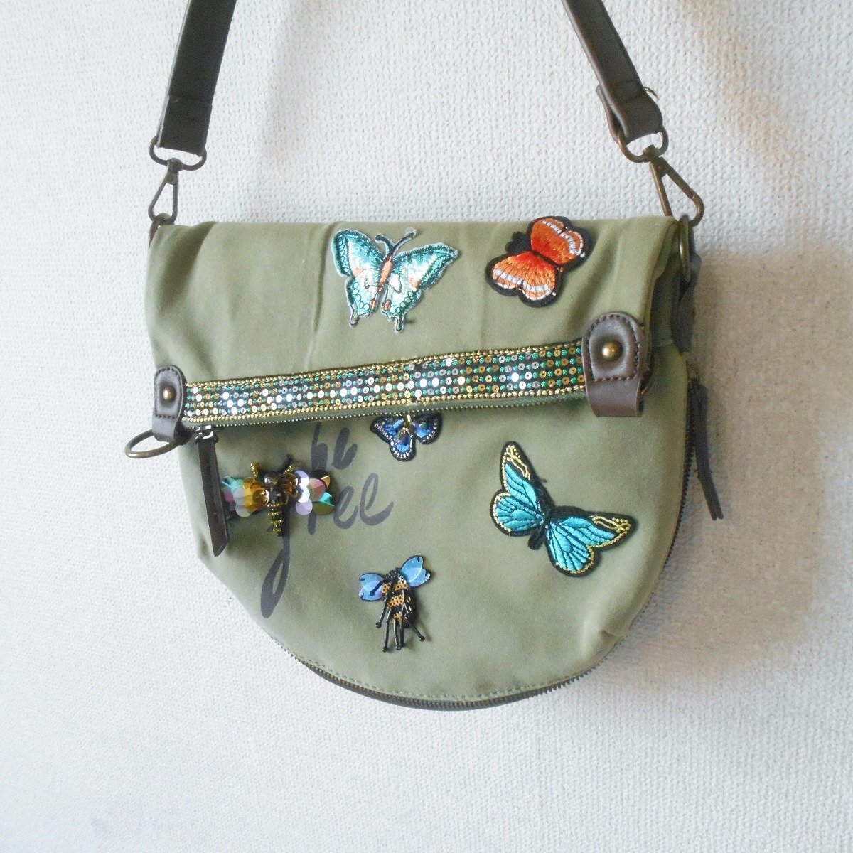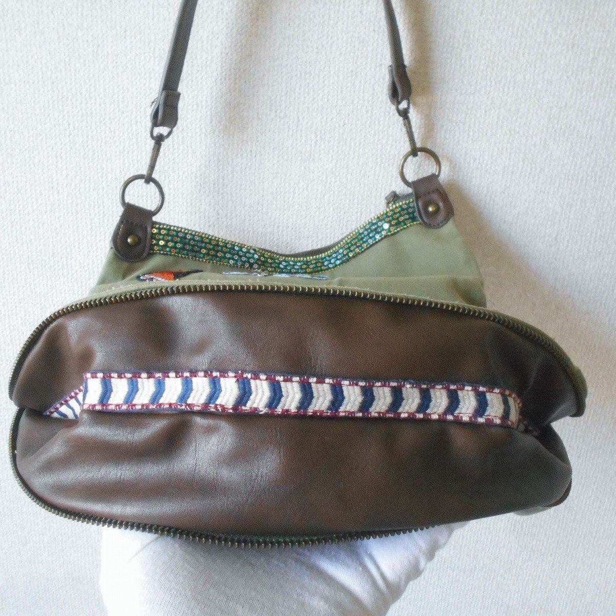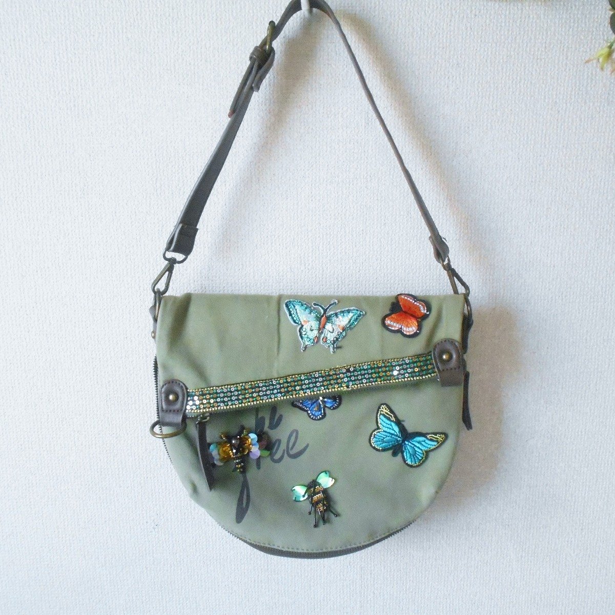 【ポイント】デジグアルのバッグになります。お色はグリーン系カーキで持ち手の位置が変えられる2WAYバッグです。