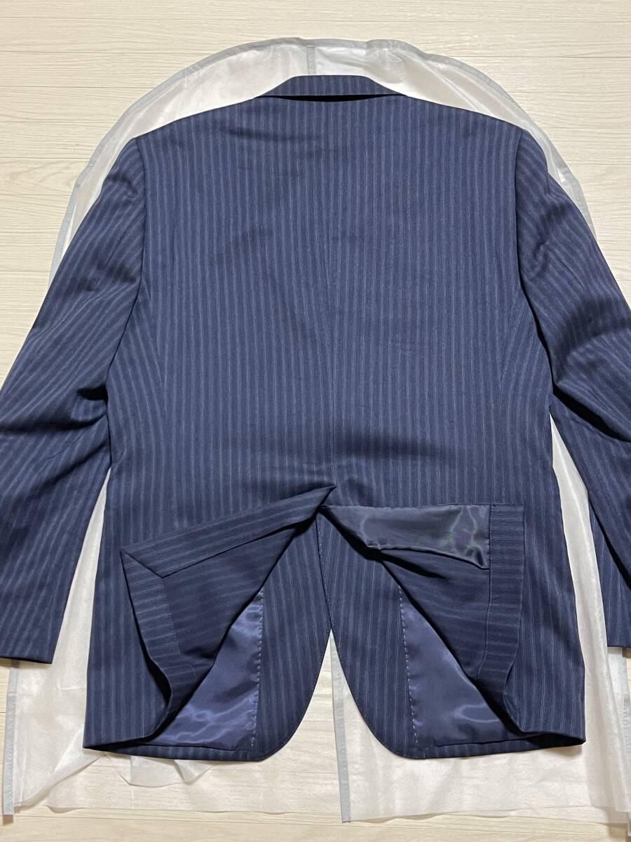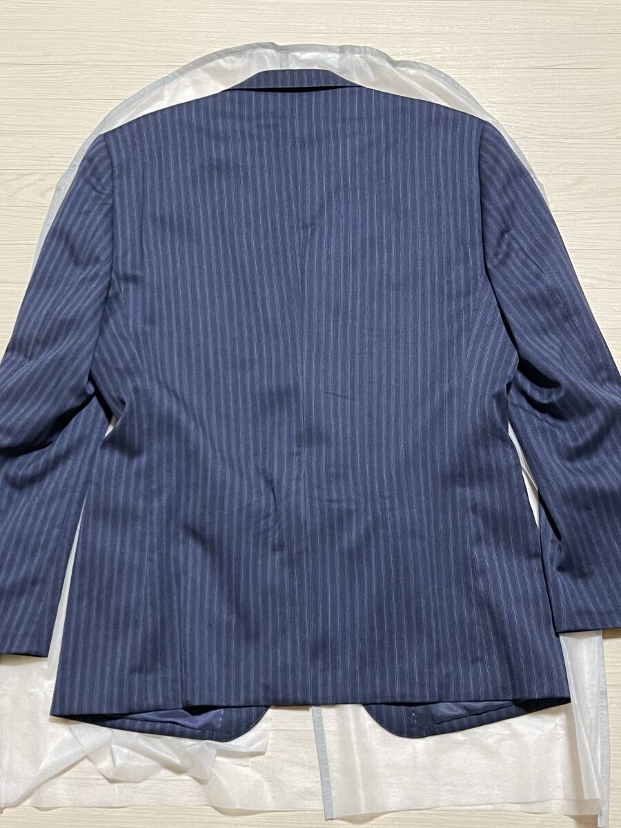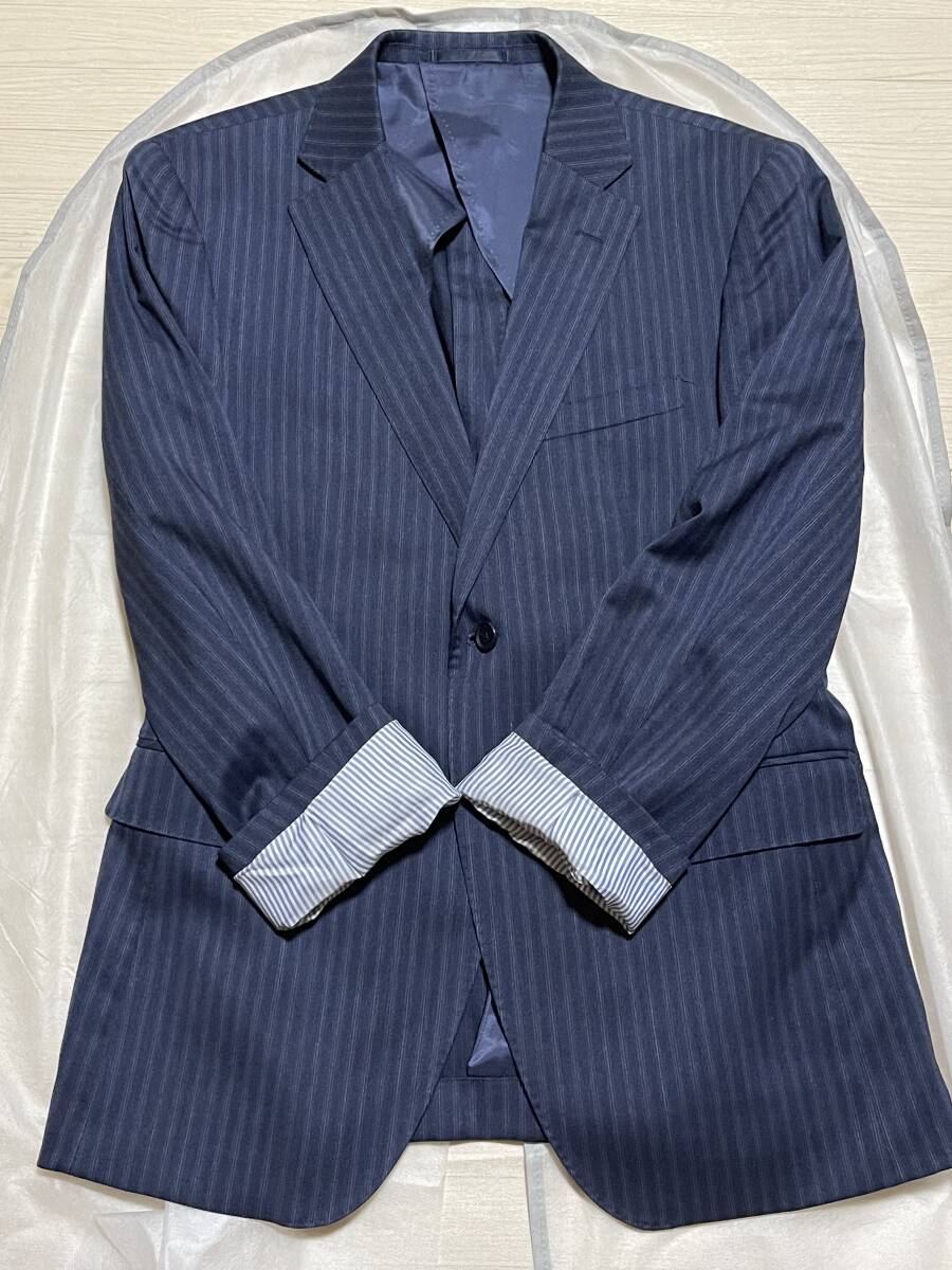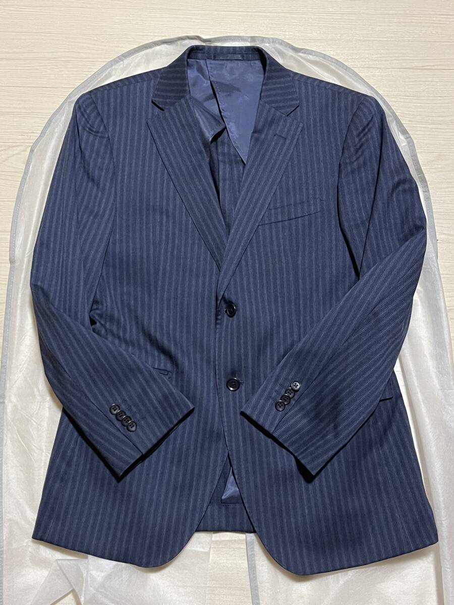 美品 AB6サイズ メンズ ジャケット ネイビーストライプ 尾州織生地 尾州メリノウール100%(メリノ種の羊から取れる高品質な羊毛、またはそれを使った毛糸のこと)