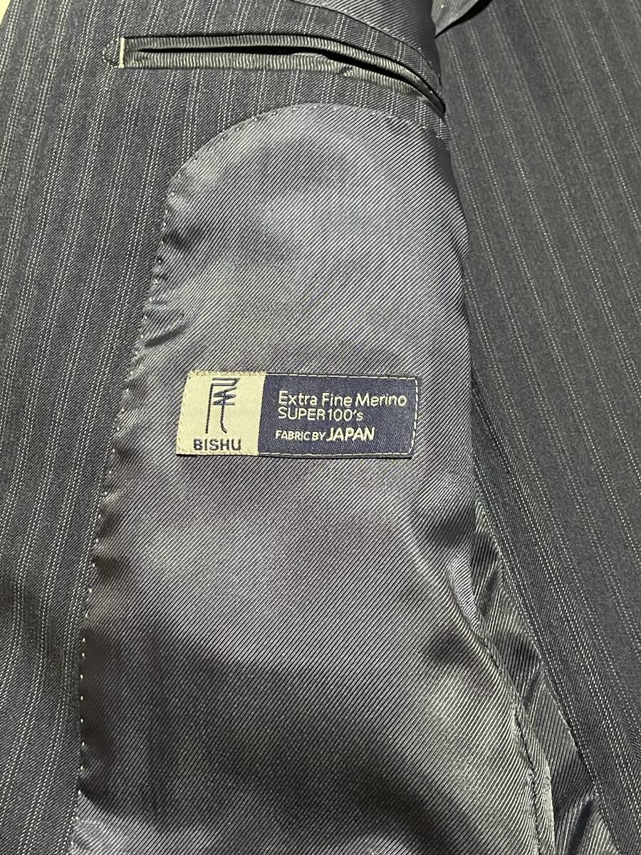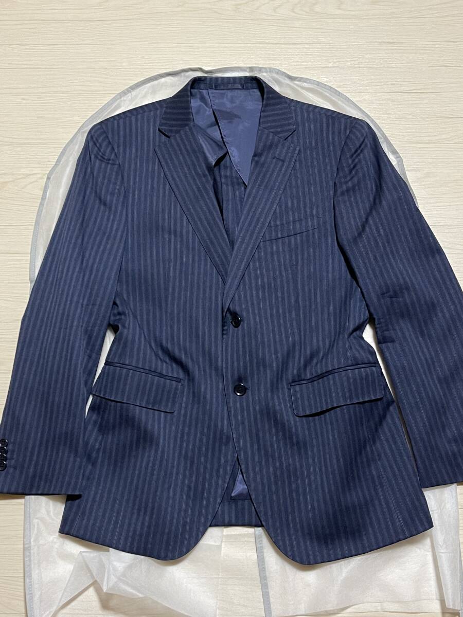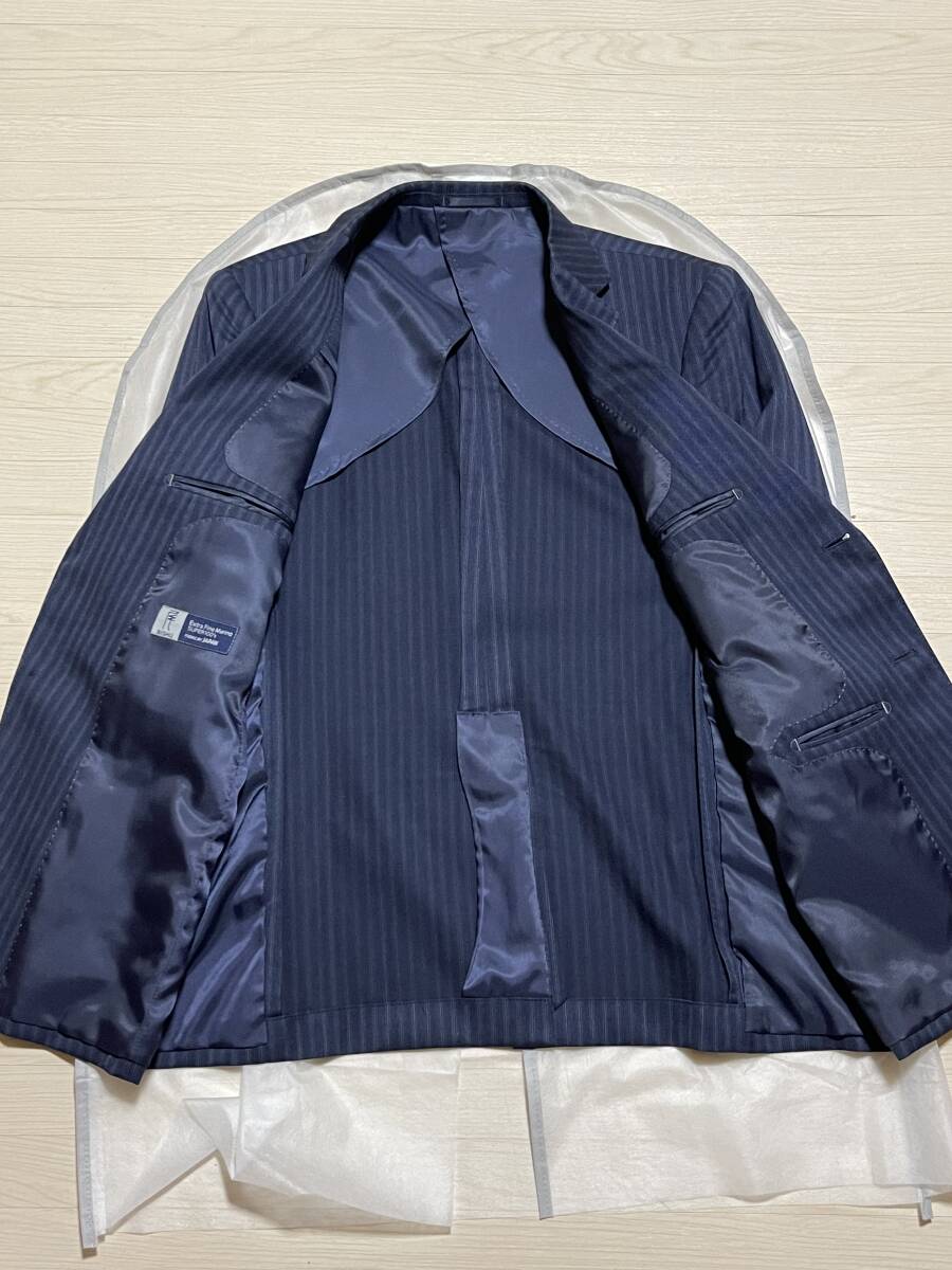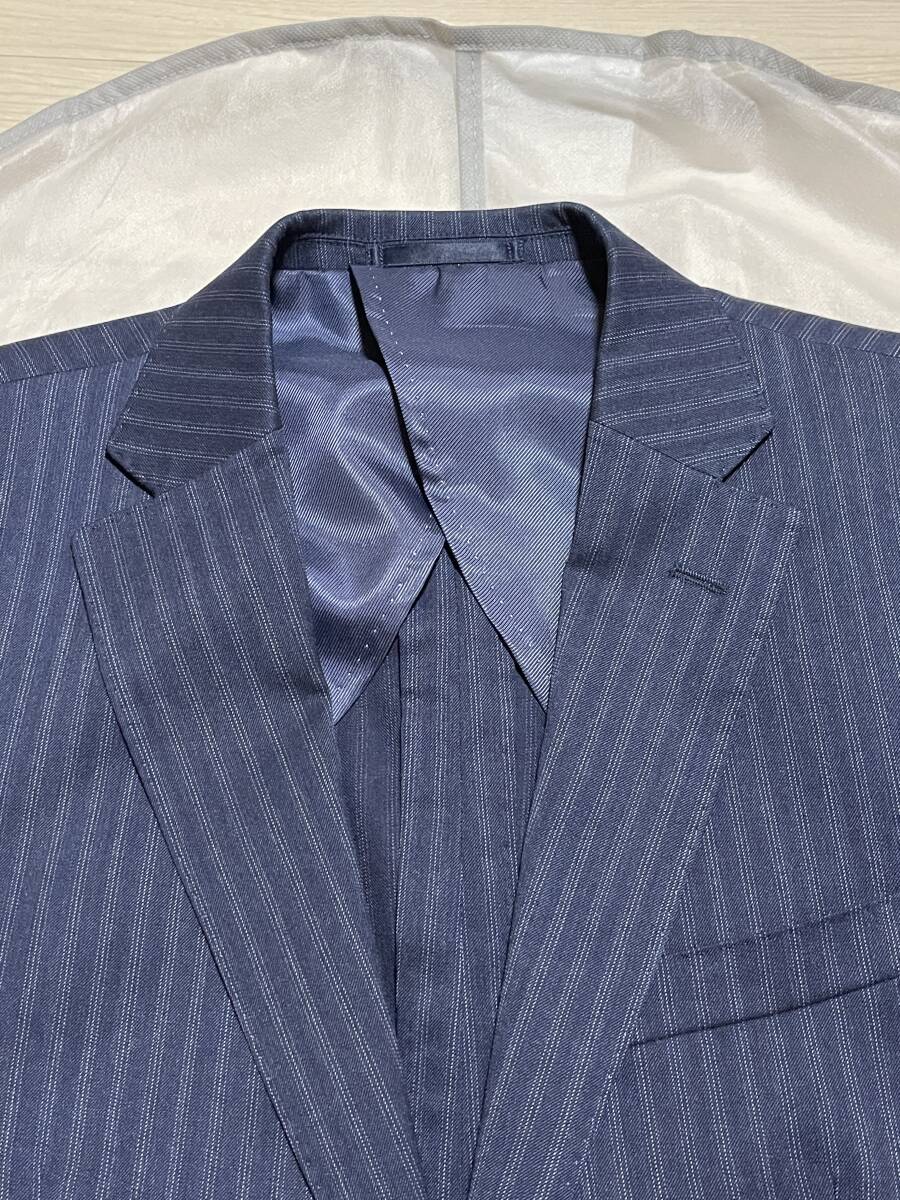 美品 AB6サイズ メンズ ジャケット ネイビーストライプ 尾州織生地 尾州メリノウール100%(メリノ種の羊から取れる高品質な羊毛、またはそれを使った毛糸のこと)