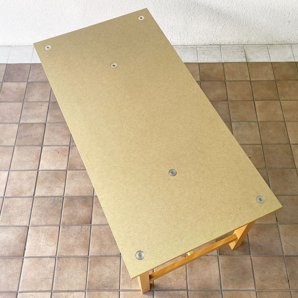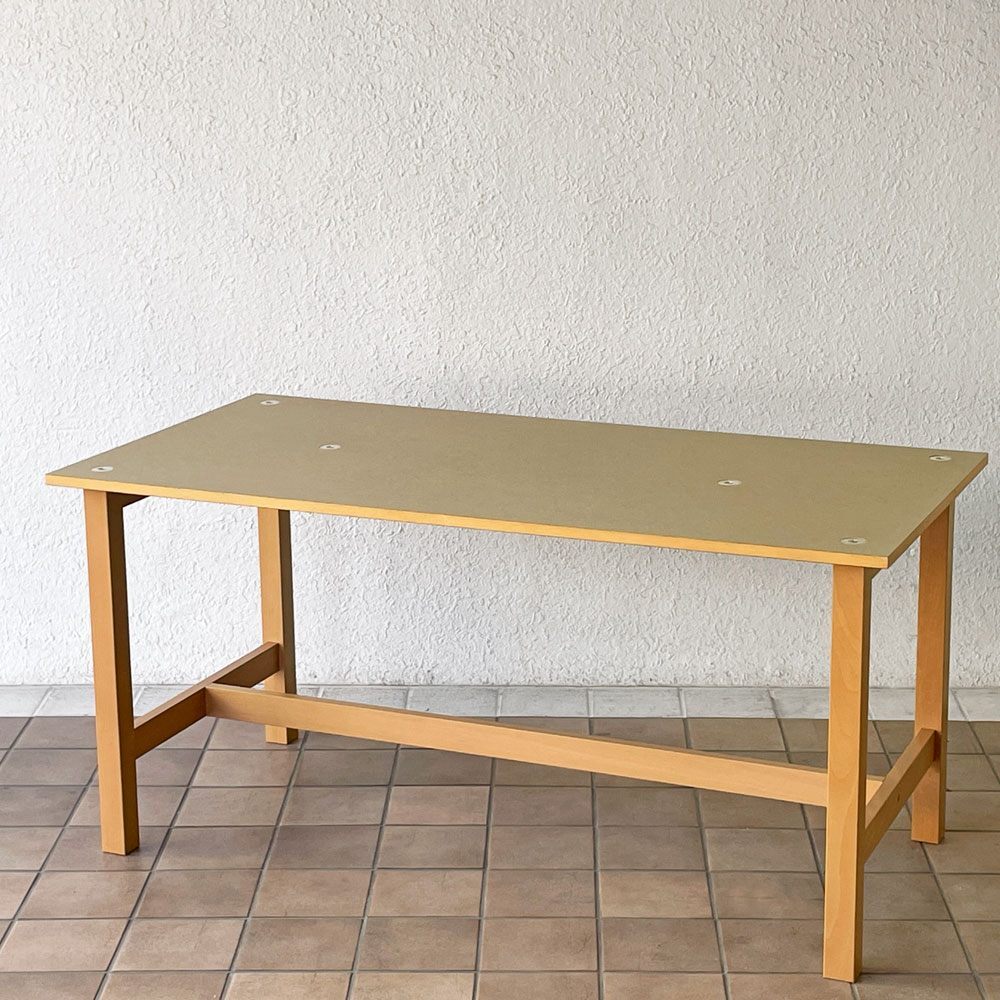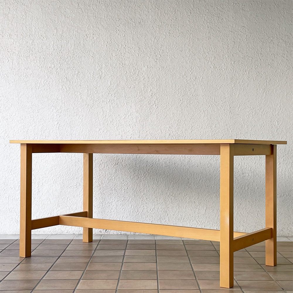| コメント | 暮らしに溶け込む優しい空気を纏った無印良品のシンプルデザイン。 現行の木製家具とは異なり、天板の金具を見せる工業系家具の様なつくりは、図工室や美術室の作業台を彷彿とさせます。また天板には熱処理した繊維がコーティングされ、ワーキングテーブルとしての使用を想定されていたよう。 確りとした角脚はそれぞれ貫で繋げられた強固な構造。実用と無骨さが両立された現在の無印良品のイメージにはない攻めたデザインは、ダイニングテーブル、作業台、ショップの什器等、様々なシーンで絵になりそうです。 ※当ショップは、主にリサイクル品を取り扱っております。基本的にUSED品である事をご理解頂き、ご入札をご検討下さいませ。 |