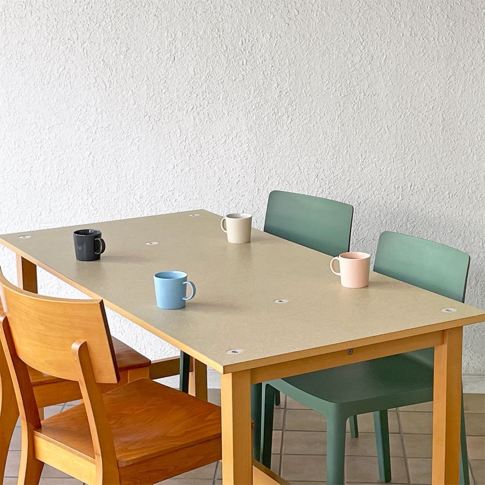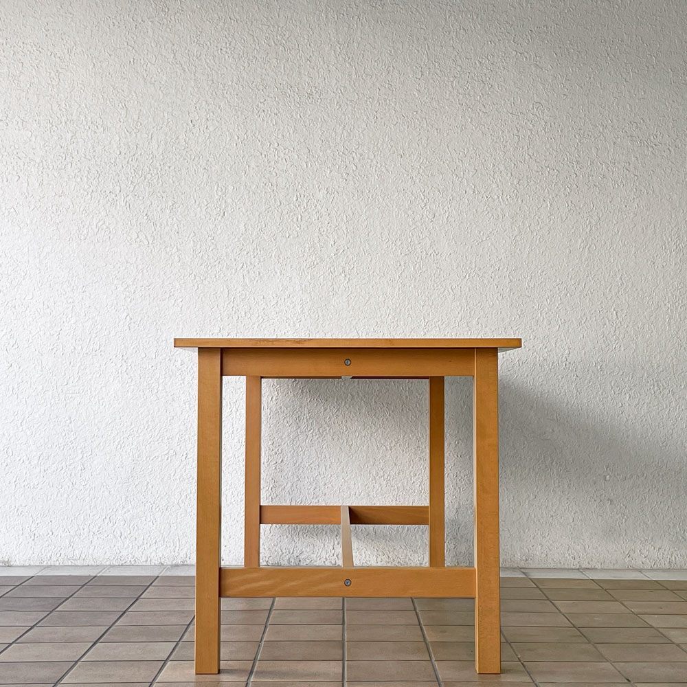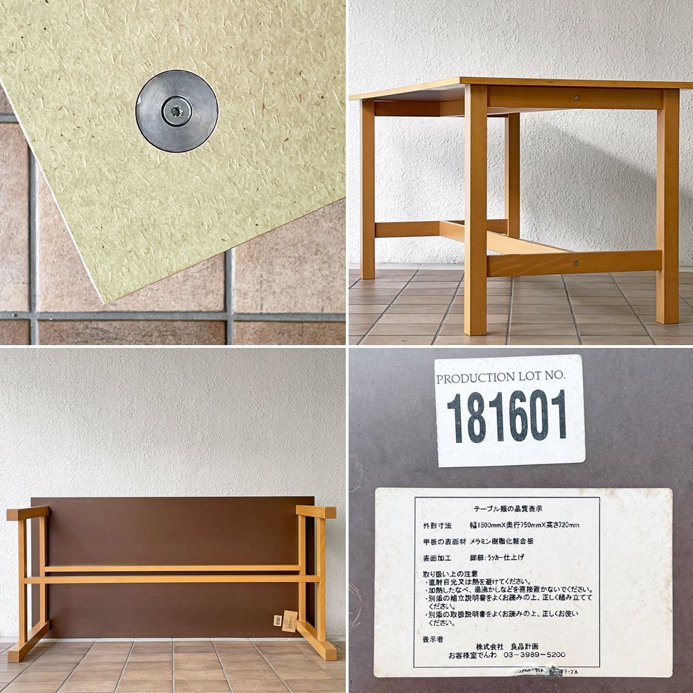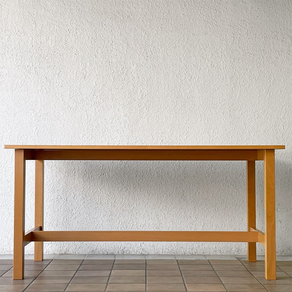 | コメント | 暮らしに溶け込む優しい空気を纏った無印良品のシンプルデザイン。 現行の木製家具とは異なり、天板の金具を見せる工業系家具の様なつくりは、図工室や美術室の作業台を彷彿とさせます。また天板には熱処理した繊維がコーティングされ、ワーキングテーブルとしての使用を想定されていたよう。 確りとした角脚はそれぞれ貫で繋げられた強固な構造。実用と無骨さが両立された現在の無印良品のイメージにはない攻めたデザインは、ダイニングテーブル、作業台、ショップの什器等、様々なシーンで絵になりそうです。 ※当ショップは、主にリサイクル品を取り扱っております。基本的にUSED品である事をご理解頂き、ご入札をご検討下さいませ。 |