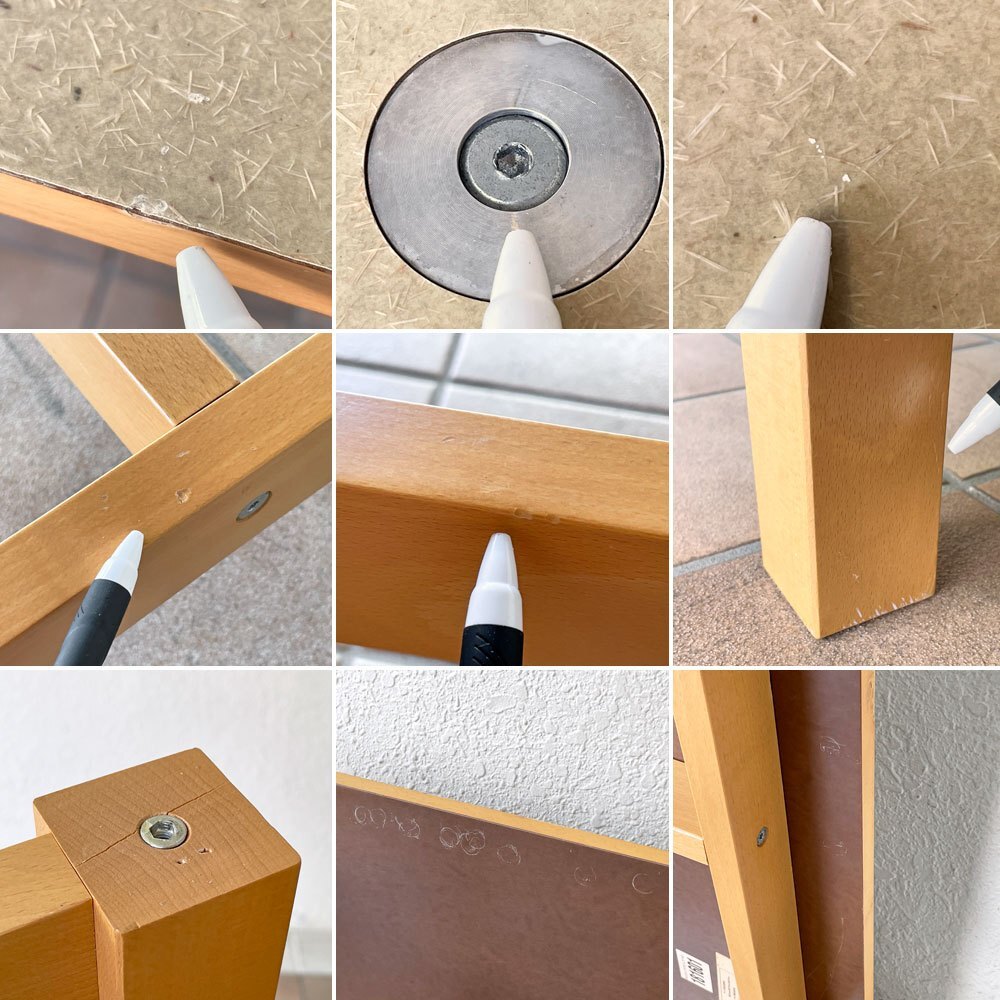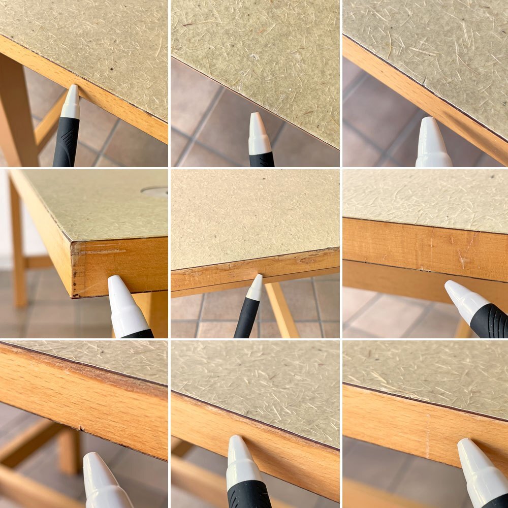 | コンディション | 使用に伴う擦れ傷の他、細かな打痕や天板側面を中心とした塗装表面の剥がれ、裏面のスクラッチなど僅かに使用感はございますが、いずれも大きく目立つものではございません。天板は脚部を先に組み立てた後、天板の上からネジで留める造りとなっておりますが、そのネジの内にややなめりが感じられるものがあり、うち1本はサイズが合うものに後年交換されております。ほか脚部フレームの木部表面にビビなどございますが現状ご使用に問題となるダメージは無く、今後とも雰囲気を楽しみながらお使い頂けるUSED品として概ね良好なコンディションを保っております。 ※特筆すべきコンディションは出来るだけ記載させて頂きますが、細かい擦れや傷、汚れ等を完全にお伝えする事は出来ません。画像をご確認の上、ご入札をご検討下さいませ。 ※取扱説明書や保証書等は記載が無い限り付属いたしません。 |