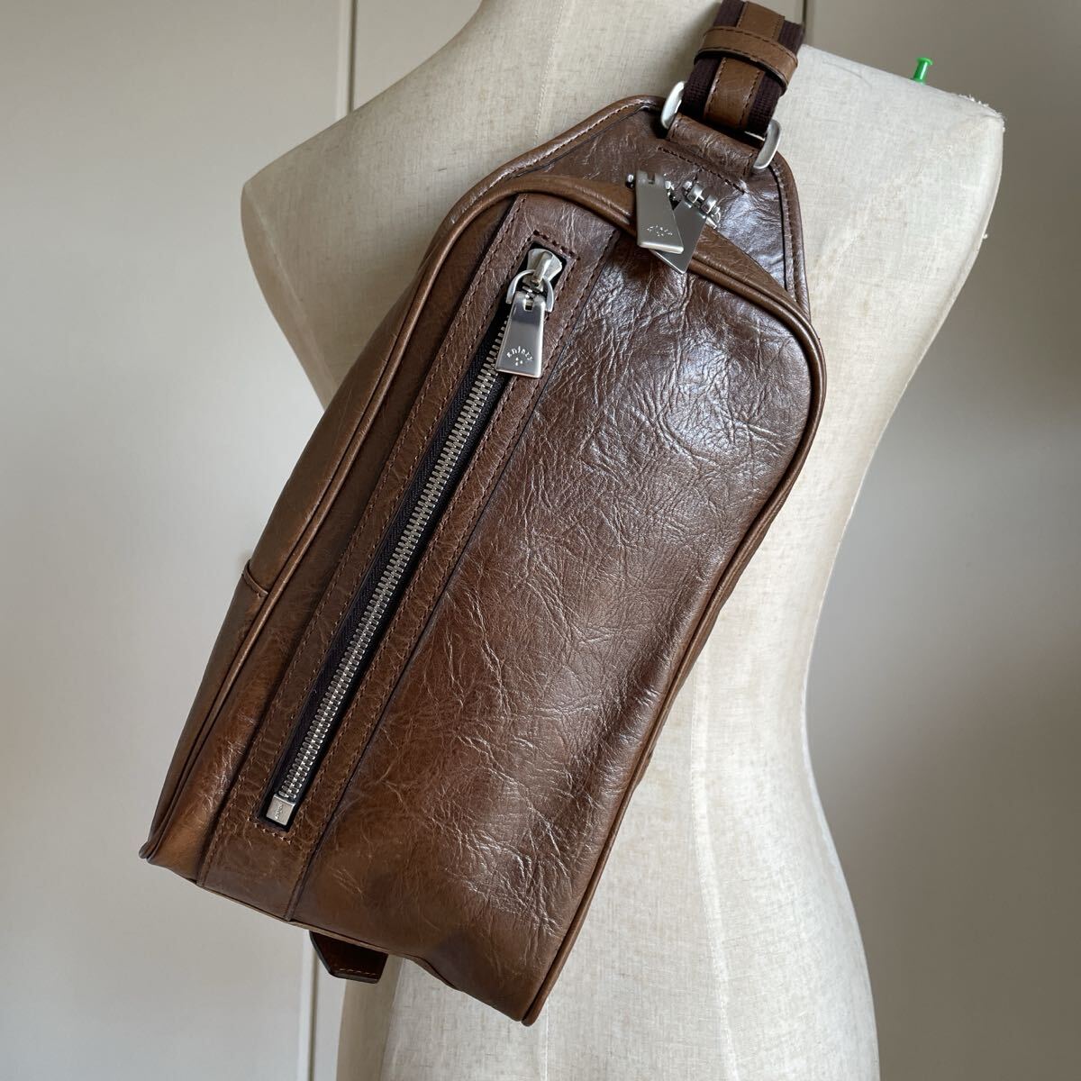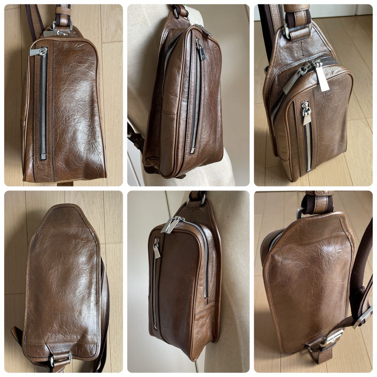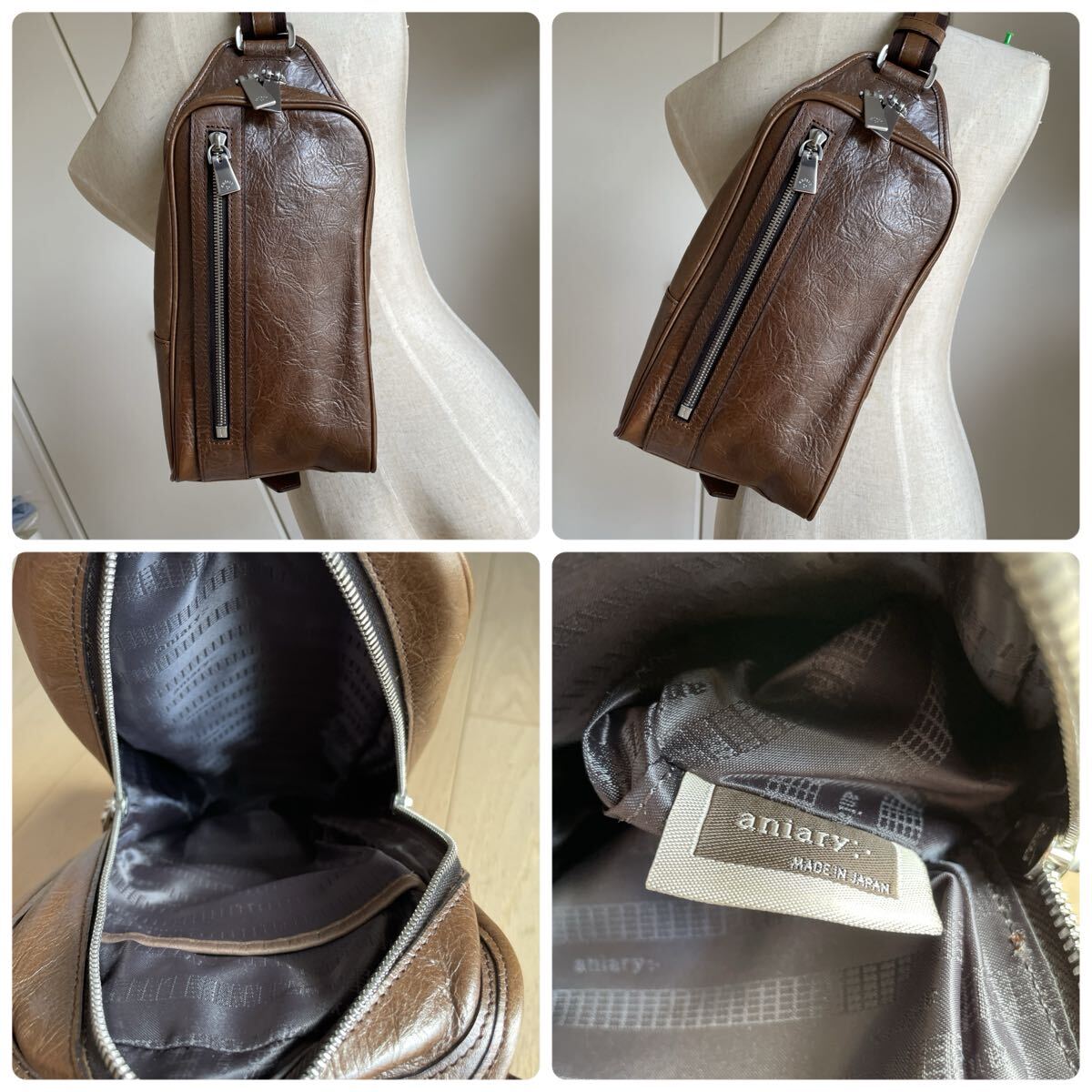 アニアリからメタリックレザーのボディバッグの出品です。