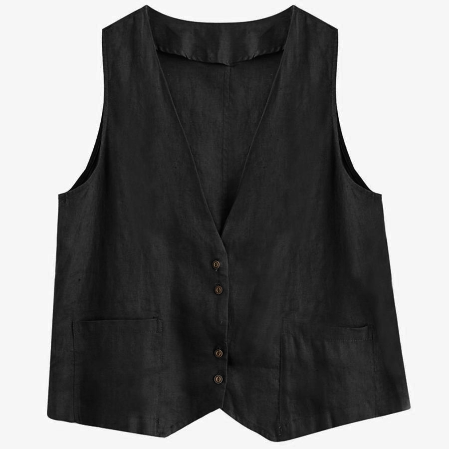 新品 リネン黒ノースリーブベスト 無地 ゆったり 春夏 ポケット付き ブラック AA701