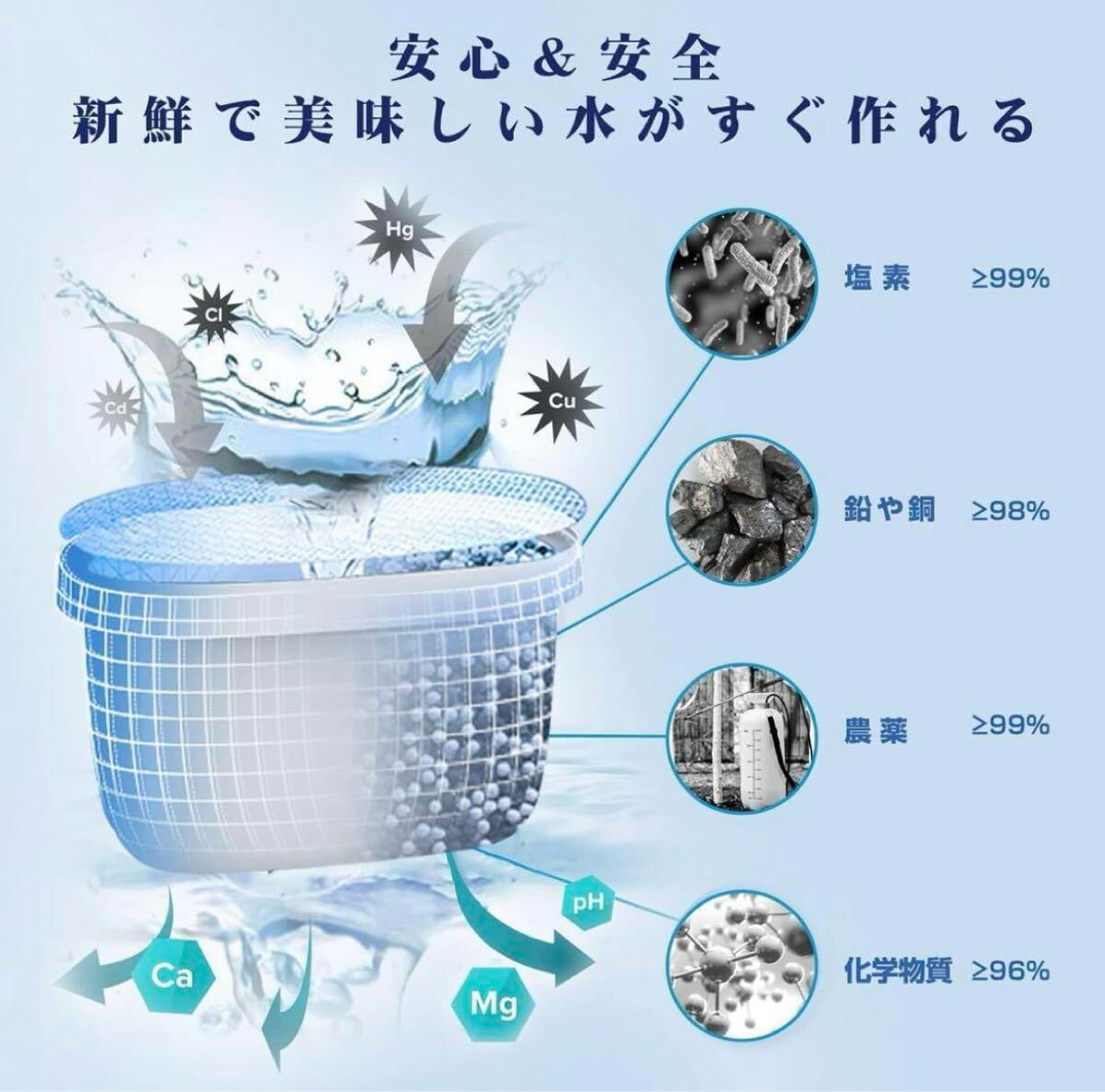 活性炭が、塩素や味に影響する物質を除去、強力なイオン交換樹脂が、鉛や銅などの金属成分を除去。水の硬度を下げ、水アカの付着を軽減することで家電製品を保護します。