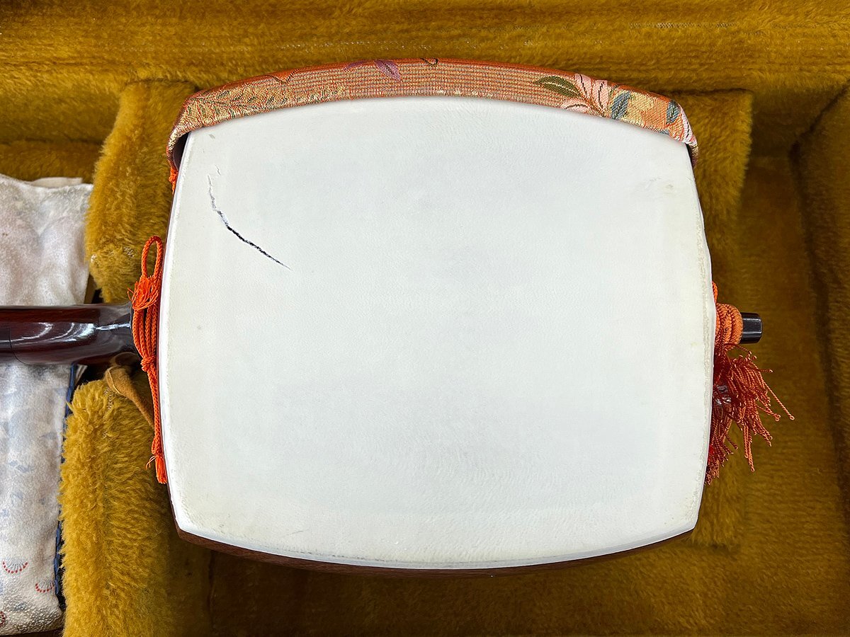 詳細不明 三味線 細棹 長唄 丸打胴 ハードケース付き 皮破れ 棹曲がり 糸巻き欠品 現状品 |