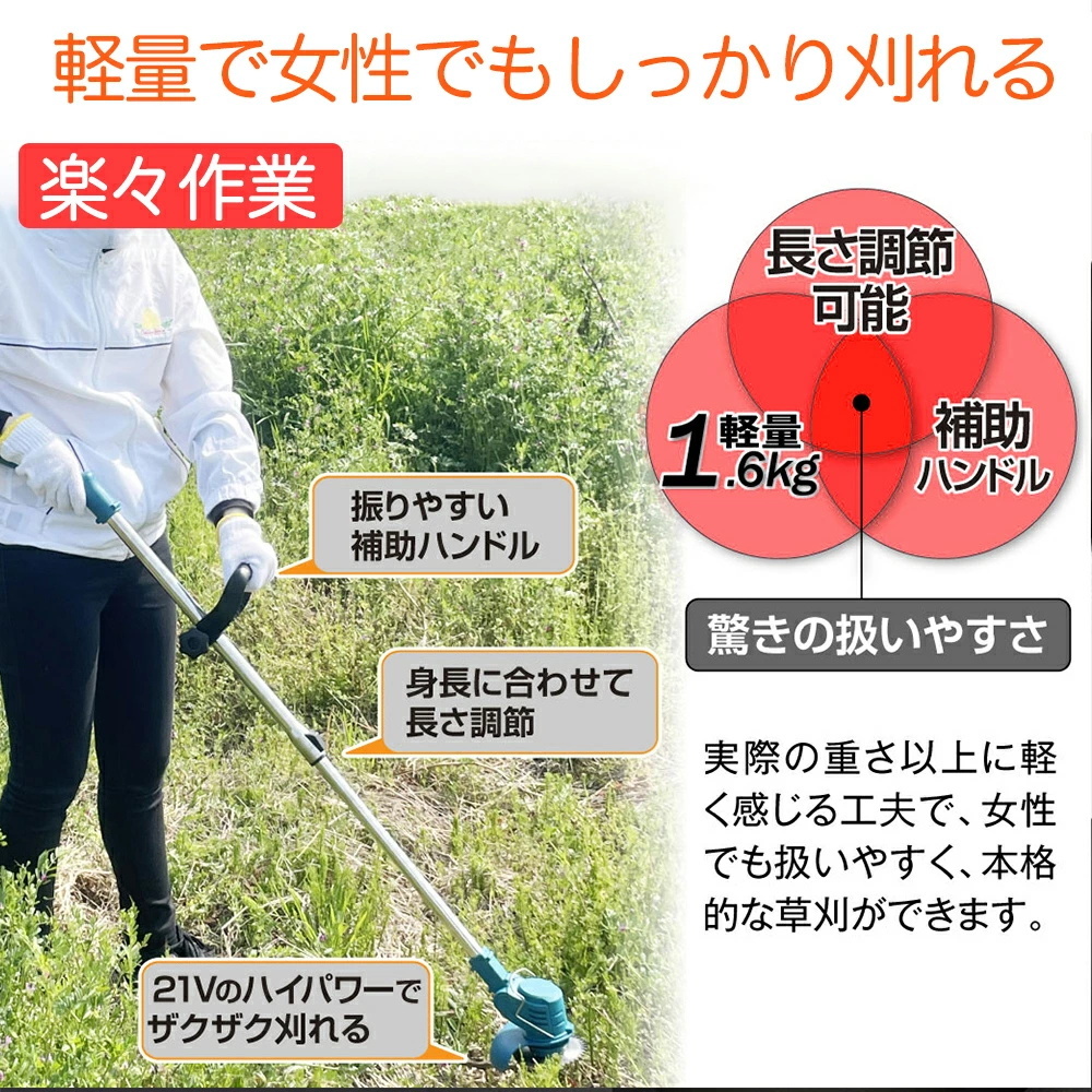 ◆軽量設計で作業がラクラク! 枝の剪定、雑草や芝生のお手入れにぴったりの軽量設計(約1.9kg)のコードレス草刈り機です。軽いので腕が疲れる事なく、女性やご高齢の方でも作業が楽に進みます。