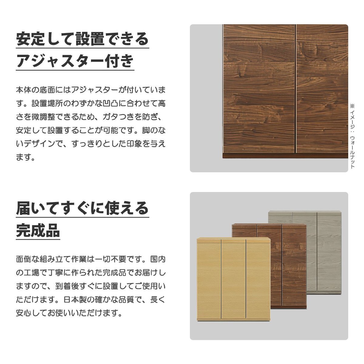 美しい木目調の本体にオーク無垢材の引手がアクセントを加えます。扉がゆっくりと静かに閉まるソフトクローズ機能や、棚板の落下を防ぐ耐震ダボを採用するなど、使いやすさと安全性に配慮しました。組み立て不要の完成品でお届けします。