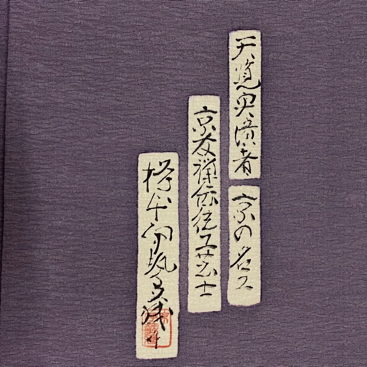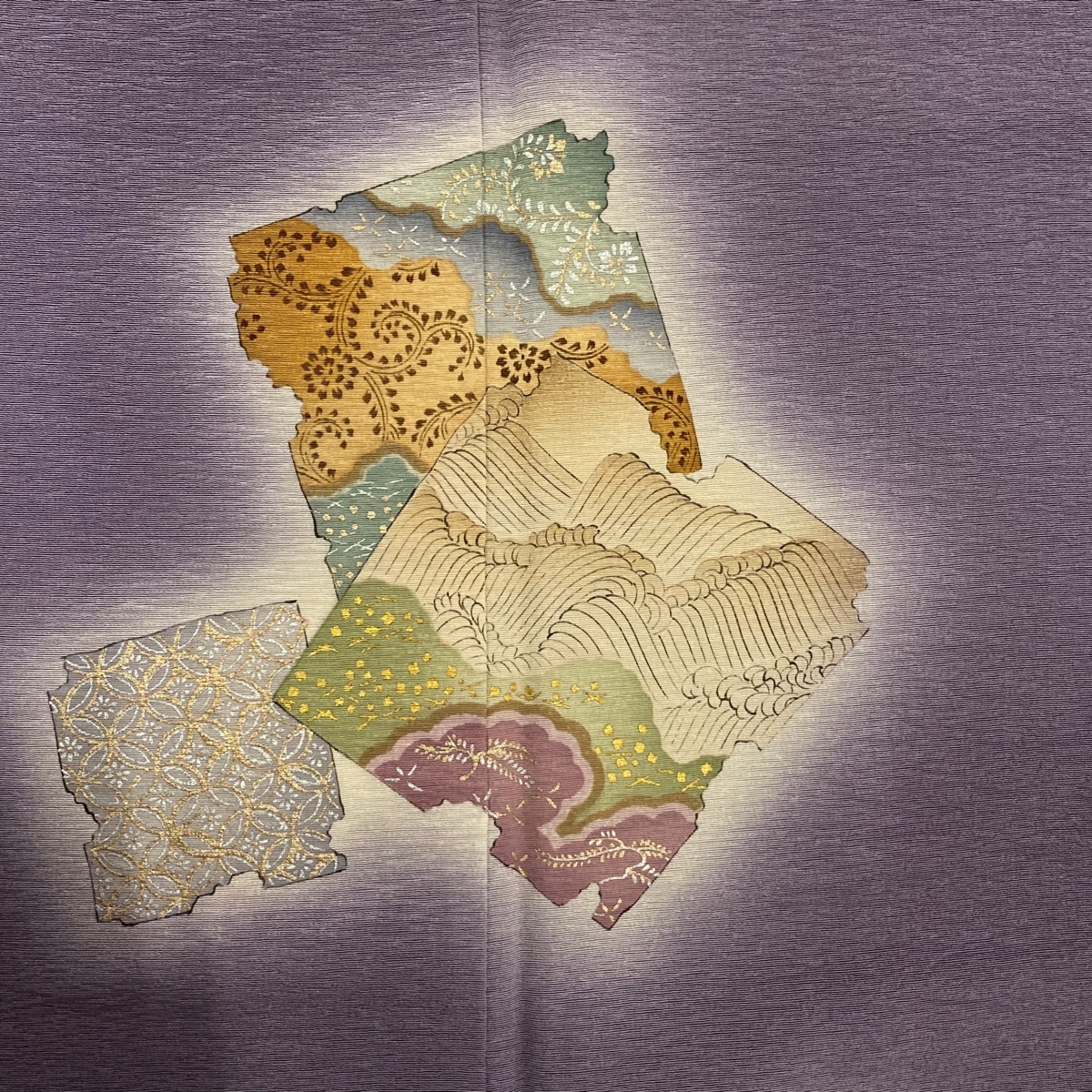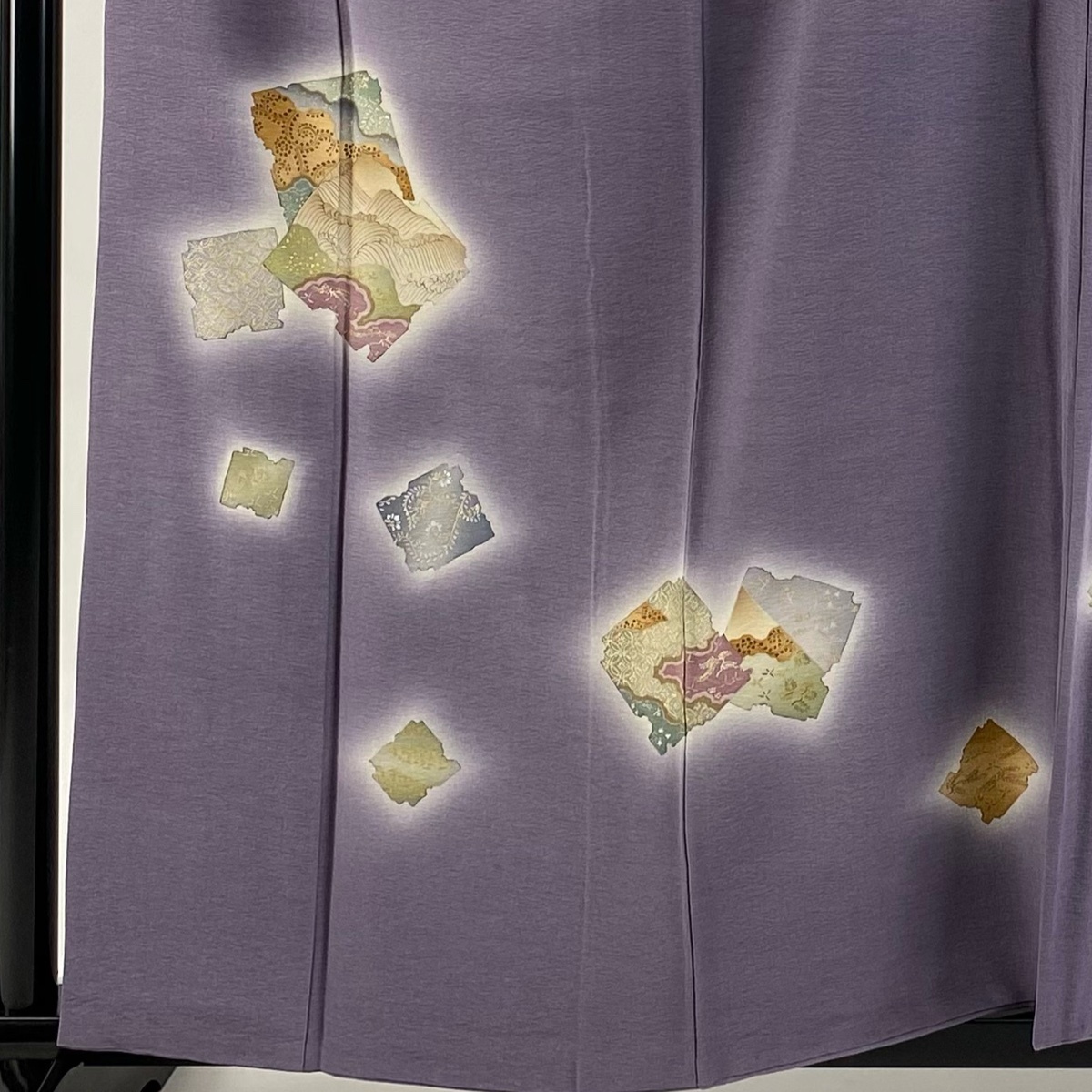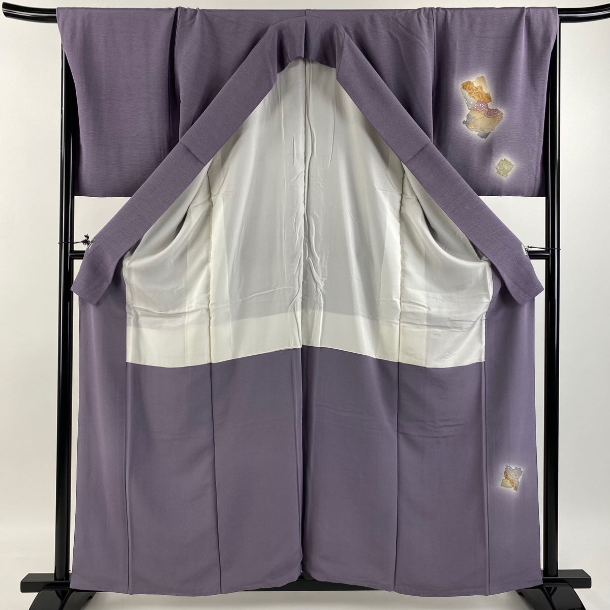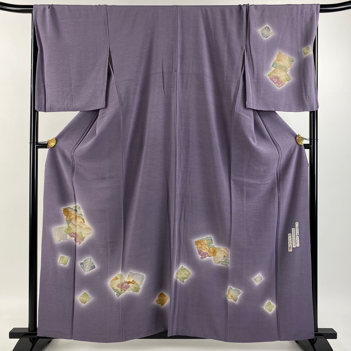 付下げ 名品 樽本伊勢蔵 落款 やまと 破れ色紙 波 金銀彩 ぼかし 紫 袷 身丈157 裄丈69.5 L 正絹 【中古】 |