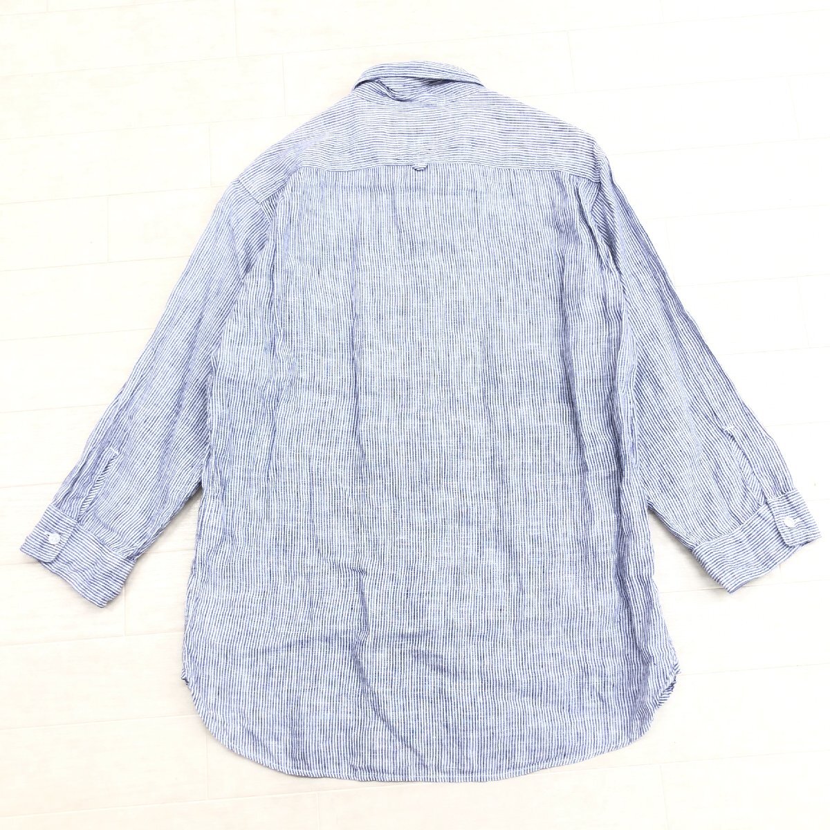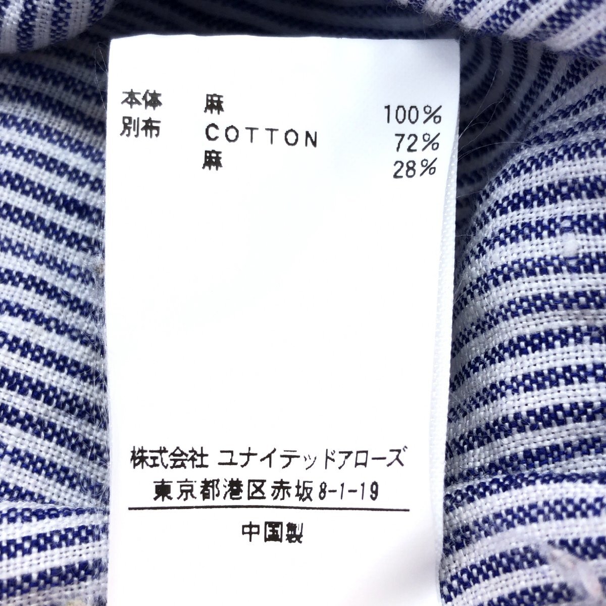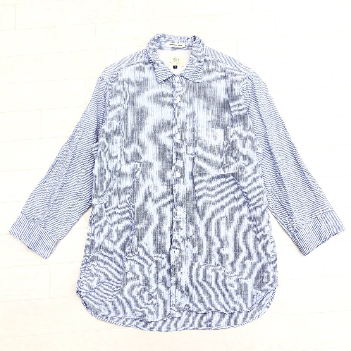 B&Y UNITED ARROWS ユナイテッドアローズ 清涼感 ストライプ 麻 リネン100% シャツ S 紺系 ネイビー系 七分袖 涼しげ カジュアル メンズ