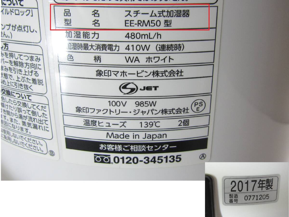 象印 スチーム式加湿器 EE-RM50 ホワイト 3段階調節 動作確認済み ZOJIRUSHI 中古品 擦り傷あり 乾燥対策 風邪予防 寝室 2017年製 その①