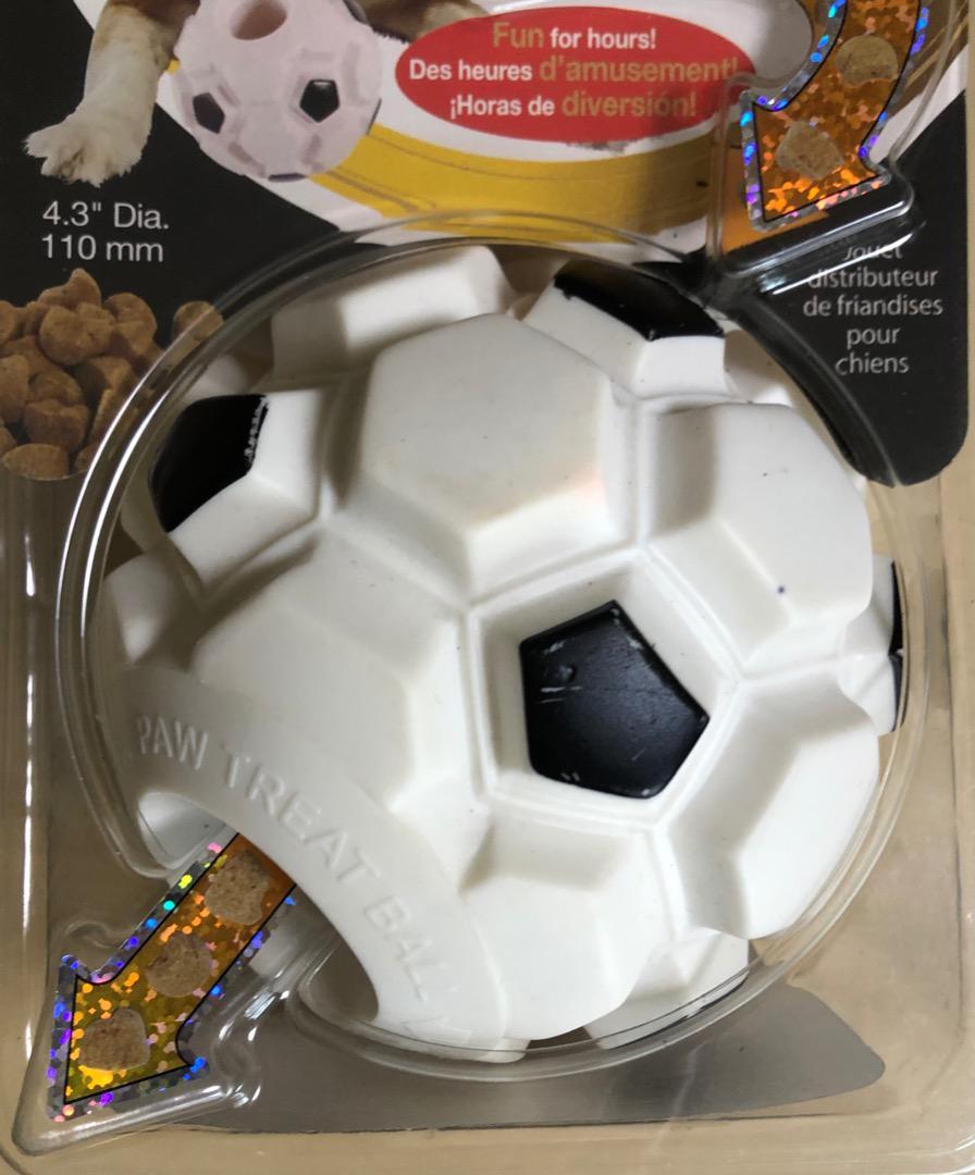 トリッキーボール大型犬用 遊びから集中力を高めます。 商品詳細: ボールの1か所に空いている穴からオヤツを入れます。 ボールの中のオヤツを取り出そうと夢中でサッカーボールを転がします。 オヤツなしでも普通のボールとして利用できます。 【商品の説明】 犬種:大型犬用 ブランド、メーカー:オメガパウ 素材・材質:ビニル樹脂 カラー:サッカーボールデザイン サイズ:L(直径110mm) 製造国:(企画:カナダ) *裏返して内側を洗う事ができるので衛生的です。 【商品の状態】 使用状況:未使用ですが黒い部分がはげている部分があります。