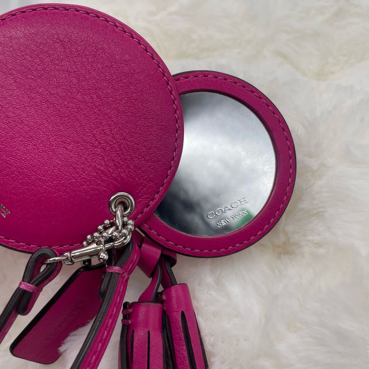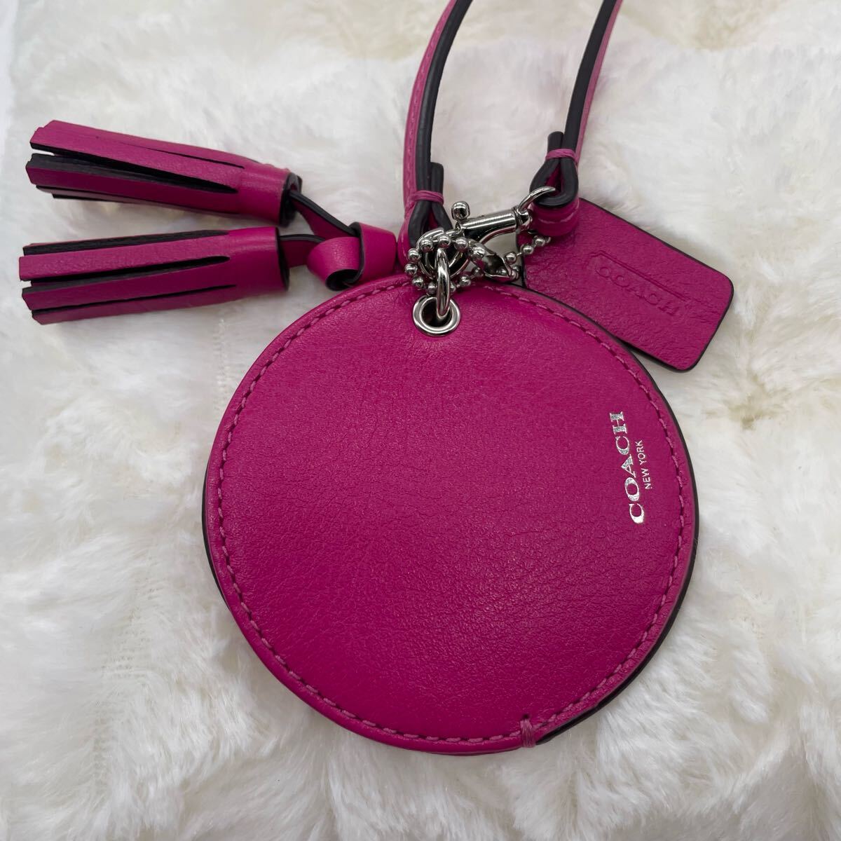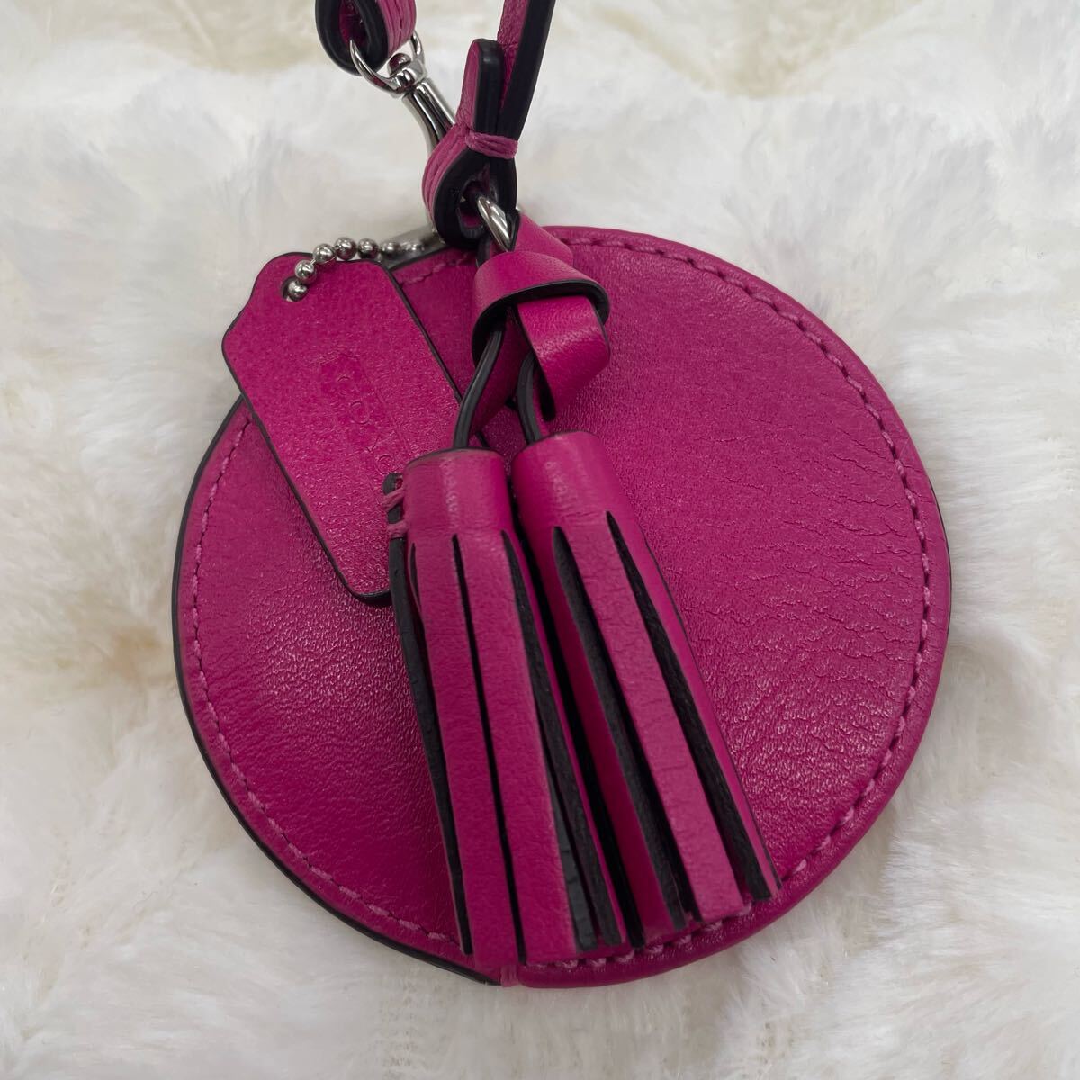 COACH コーチ 丸型レザーコンパクトミラー 鏡 マゼンタカラー×タッセル付き ストラップ付きポーチ チャーム ブランド u9437