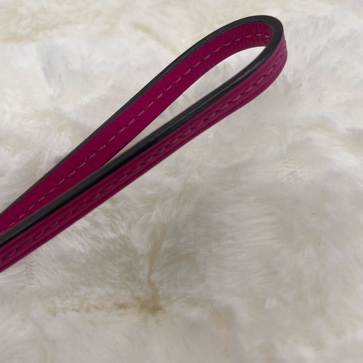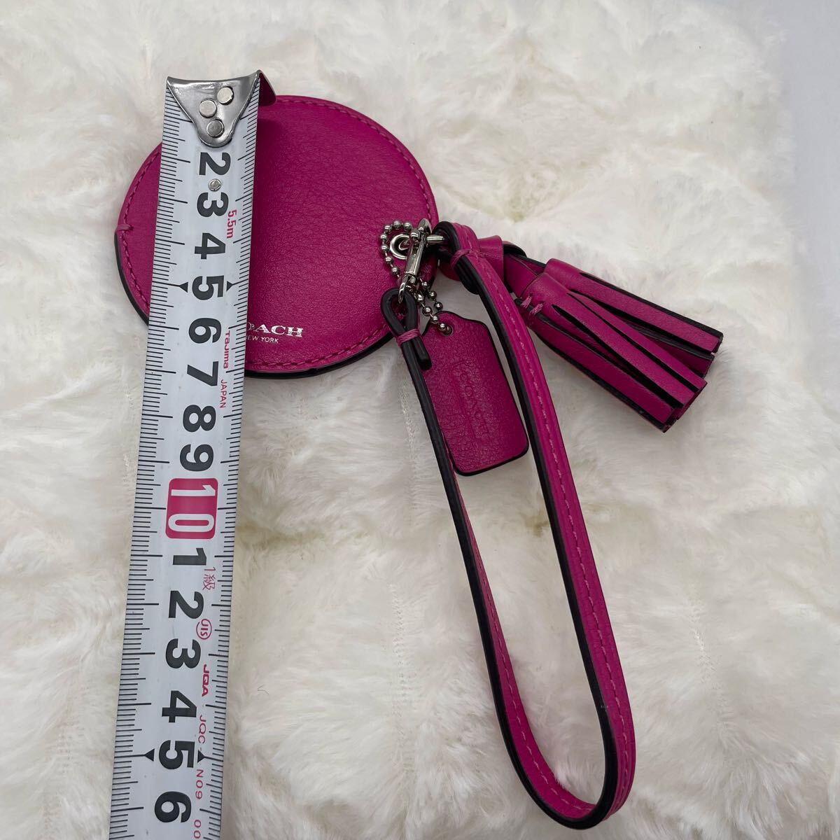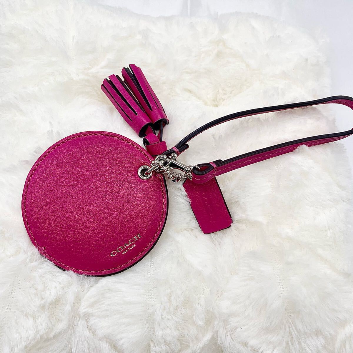 COACH コーチ 丸型レザーコンパクトミラー 鏡 マゼンタカラー×タッセル付き ストラップ付きポーチ チャーム ブランド u9437