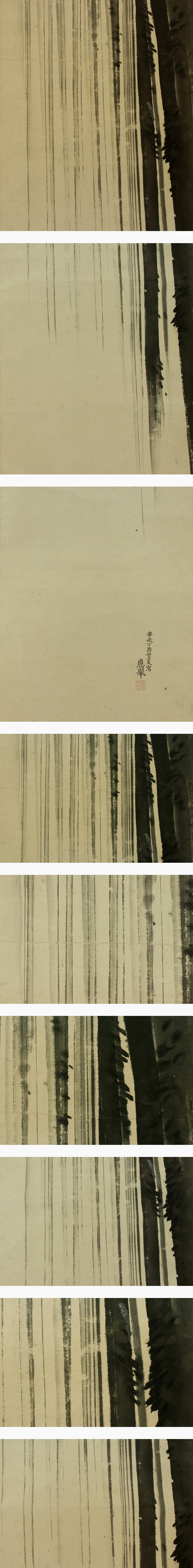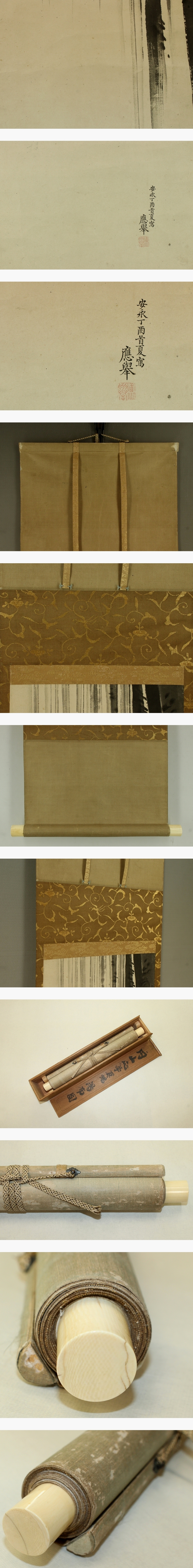円山応挙 まるやま-おうきょ(1733-1795) 江戸後期の画家。円山派の祖。丹波生。 字は僊斎・仲選、号は一嘯・夏雲・仙嶺等、通称は主水。 石田幽汀に狩野派の画法を学び、幽汀の写生的画法に、宋・元画の技法を取り入れると共に、 西洋画の遠近法を研究して一家を成した。動植物の写生を最も能くする。 寛政7年(1795)歿、63才。 本紙は、染み、汚れ、折れ、皺があります。 表装は、染み、汚れ、折れ、皺、虫食い、破れ、ほつれ、擦れ、軸先に軽い汚れとヒビがあります。 【サイズ】 作品 横約27.5cm×縦約90cm 表装 横約30.5cm×縦約178cm |
