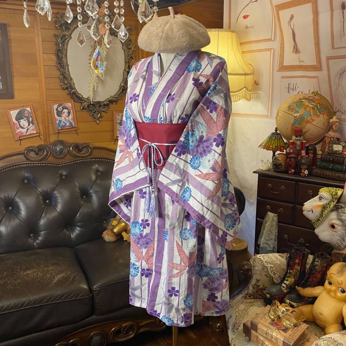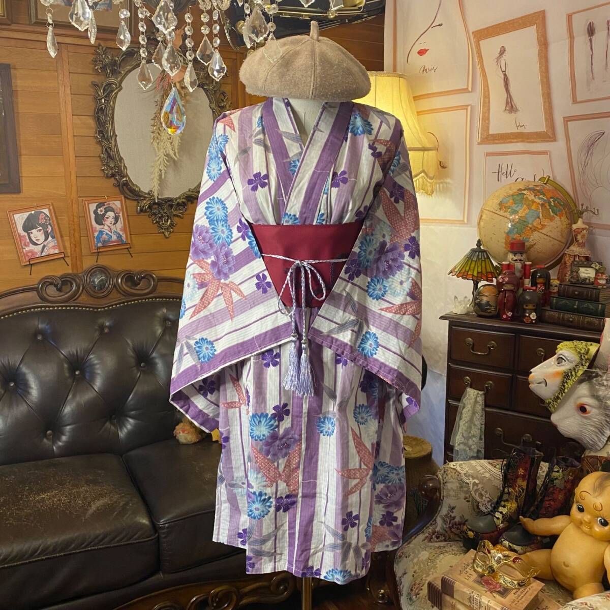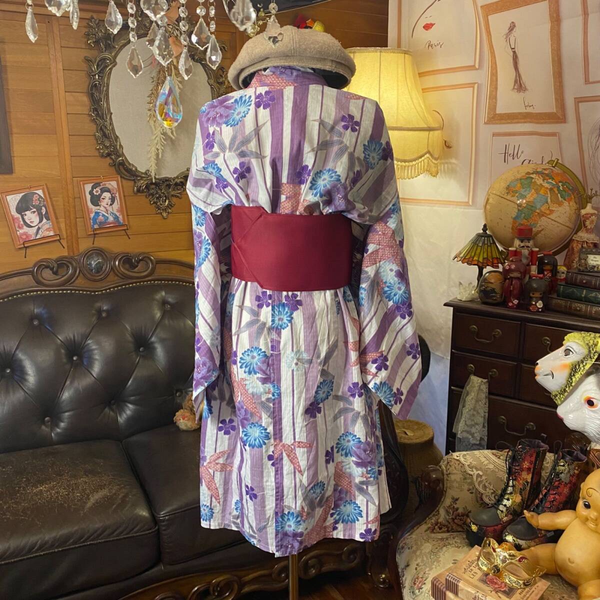 【浴衣リメイク ミニミディ ワンピース ドレス 名古屋帯サッシュベルト付 和洋折衷 レトロ 古着 ハンドメイド 藤霞のストライプに瑠璃菊と牡丹が咲き競う W-650】