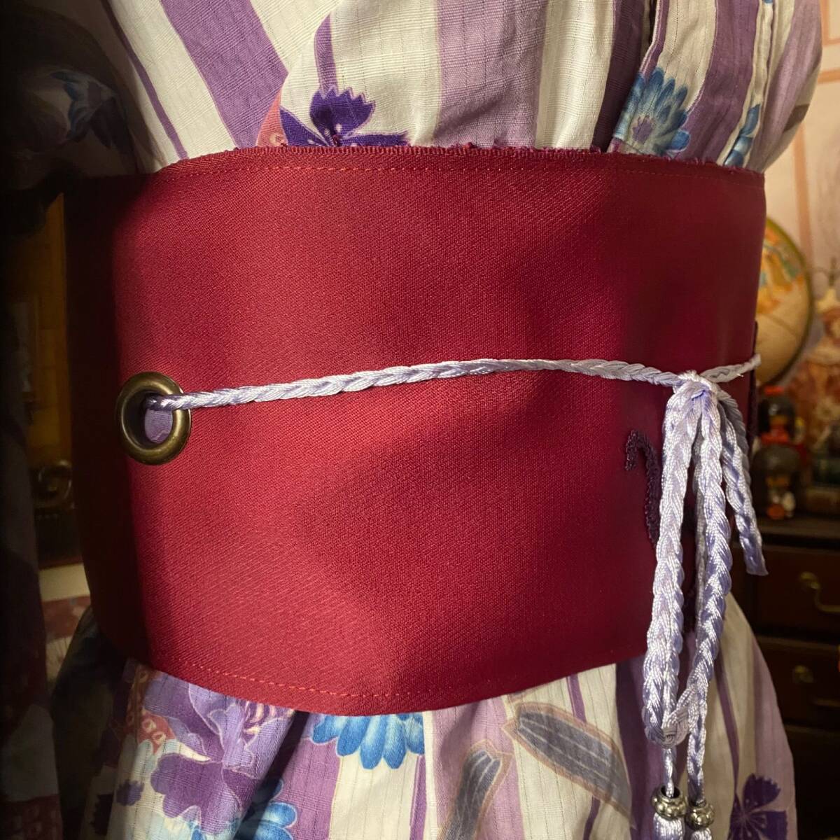 藤霞のストライプに瑠璃菊と牡丹が咲き競う昭和レトロな浴衣をリメイク。ゆらぐラベンダー×生成りの縦縞が視線をスラリと導き、くすみブルーの花々と朱竹のアクセントが奥行きを添えます。ウエストにはワインレッドのサッシュベルトを一点投入。藤色タッセルが揺れ、甘さをキリッと引き締めながらモードな陰影をプラスしました。スニーカーでデイリーに、黒レースアップブーツで夜景デートに。クラシカルとストリートが交差する、真夏のときめきを閉じ込めた一点物です。
