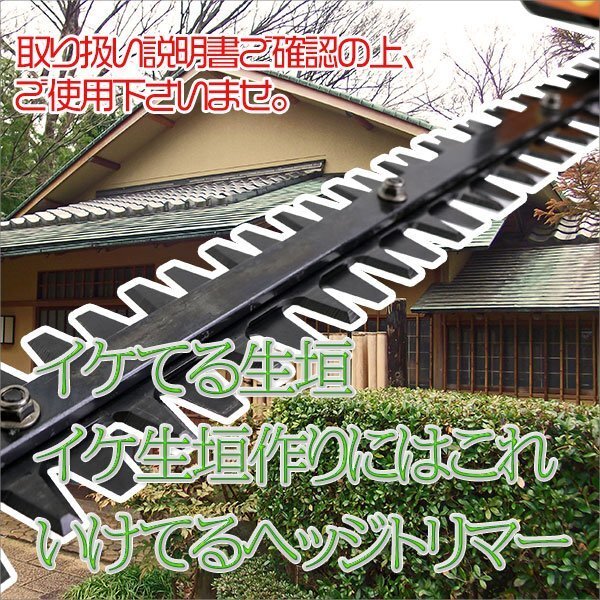 | 商品の詳細 | エンジン式ヘッジトリマーです。 生垣の刈り込み・庭園の管理・お茶の刈り込みにも最適です。 エンジン 2サイクルエンジン 排気量 22.5cc 刈 刃 560mm(両刃) 使用燃料 潤滑油混合ガソリン ガソリン:2サイクル専用オイル=25:1 燃料タンク容量 0.6リットル 英語説明書 | |