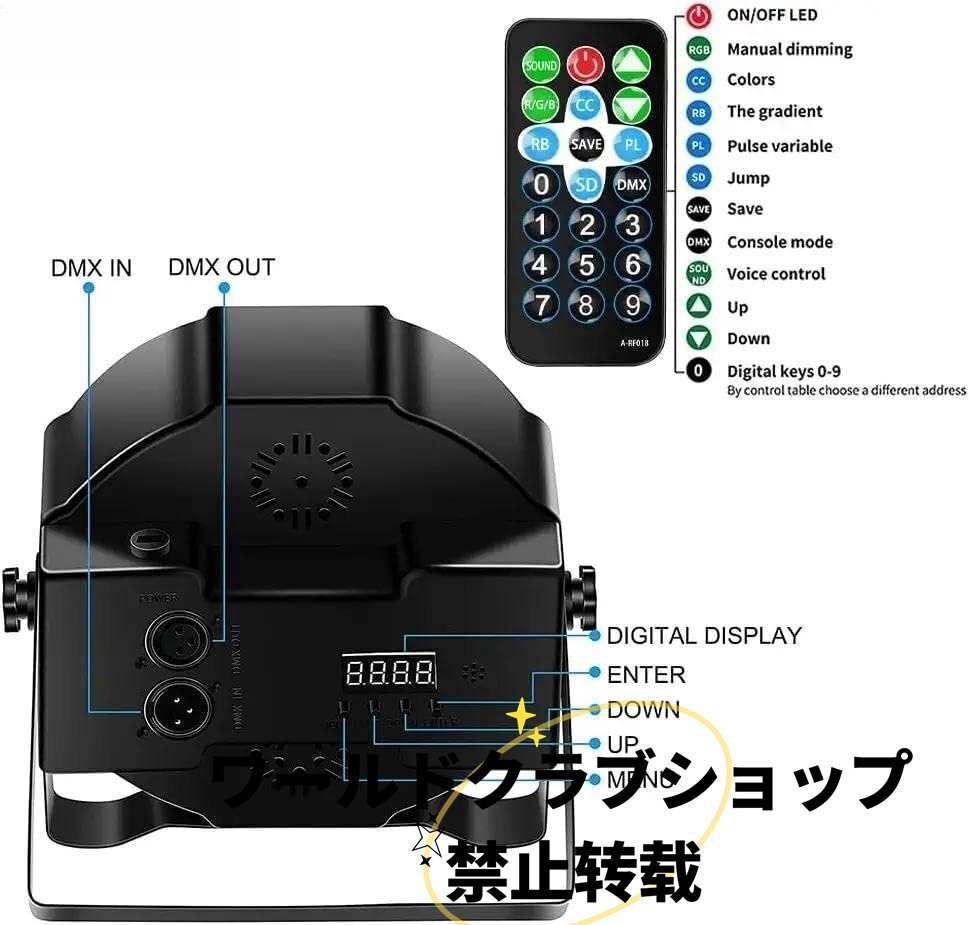 【4動作モード】DMX512、サウンドアクティブ化、マスター/スレーブおよび自動モード。調整可能な速度を変えることで、静電色、ジャンプ、段階的、ストロボおよびスクロール照明効果。また、さまざまな設定や明るさのレベルを持ち、追加のストローブ効果を持つリモコンが付属しています。