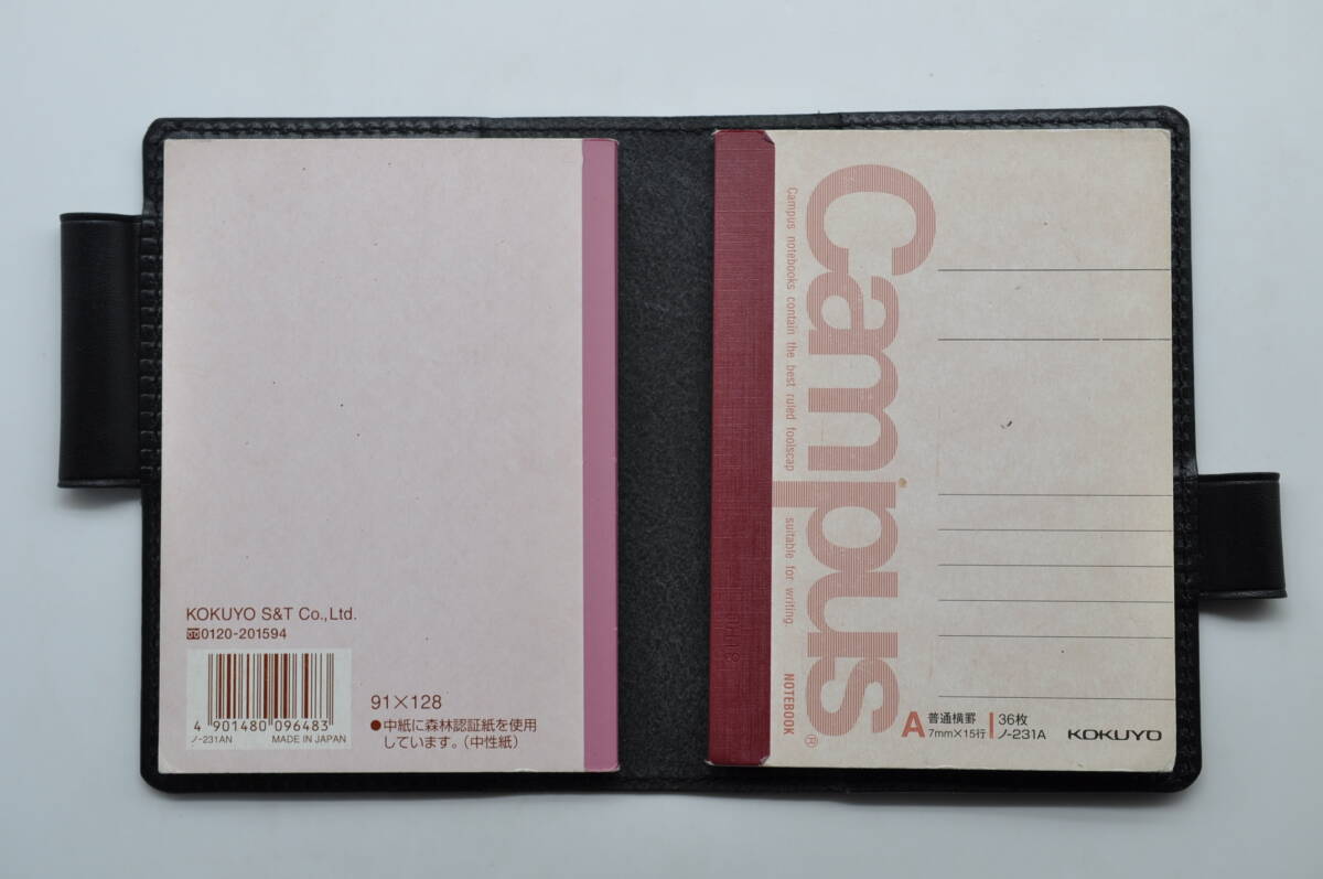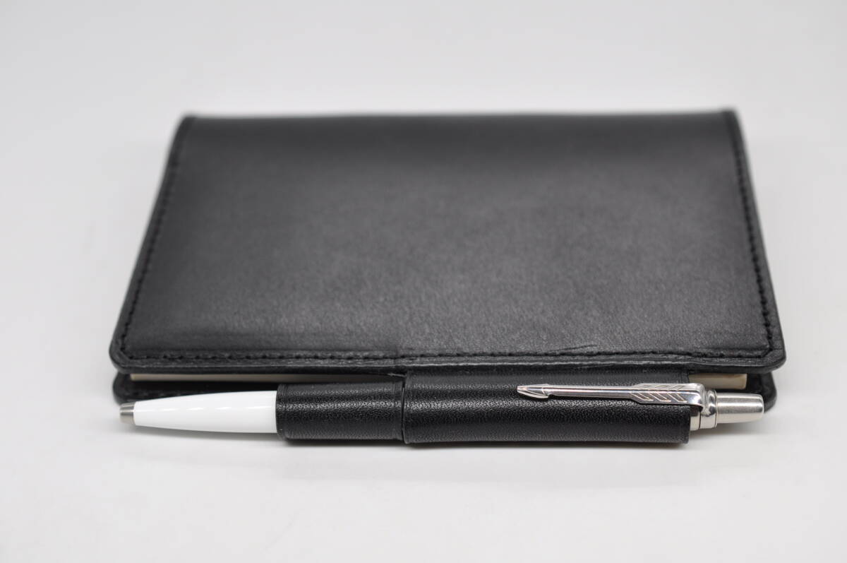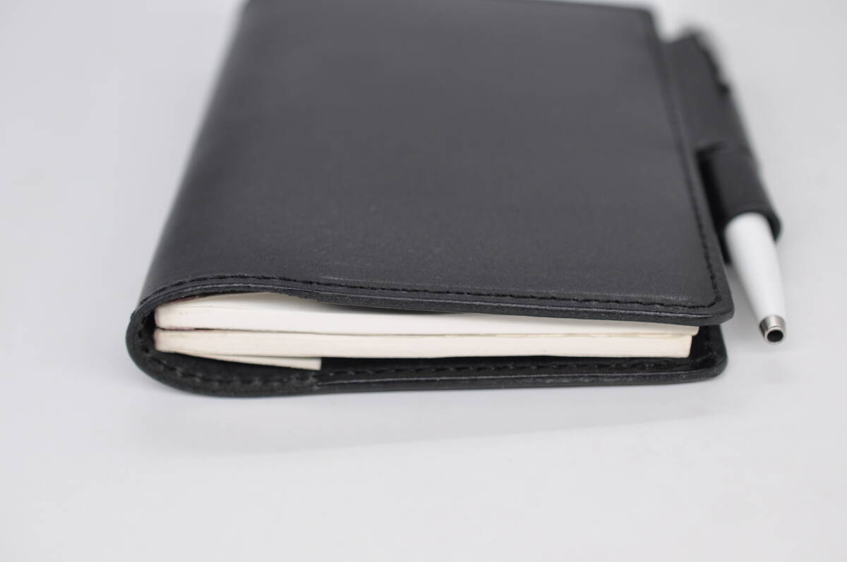 サイズは閉じた状態で、縦約140mm、横約105mmです。差し込みを深くとっているので、B7ノートを左右に1冊ずつ挟めます。(厚み10mmまでのB7サイズの手帳やノートが挟めます)