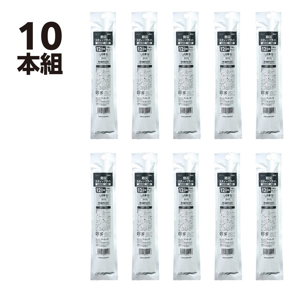 折り曲げるだけで簡単に発光する「防災スティックライト」の10本セットです。火や電力を一切使わず、災害時や停電時でも安全に使用可能。発光色は黄色、最大12時間発光します。長期保存(5年)が可能で、防災備蓄用におすすめです。1本使い切りタイプなので非常時の備えとして手軽に準備できます。