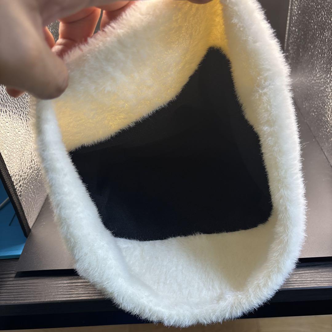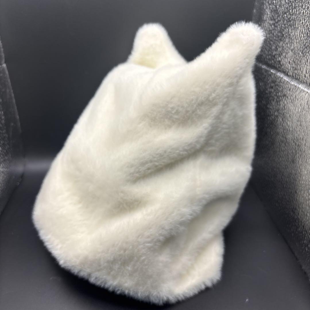 猫耳デザインのホワイトニット帽、フリース素材で暖かい。