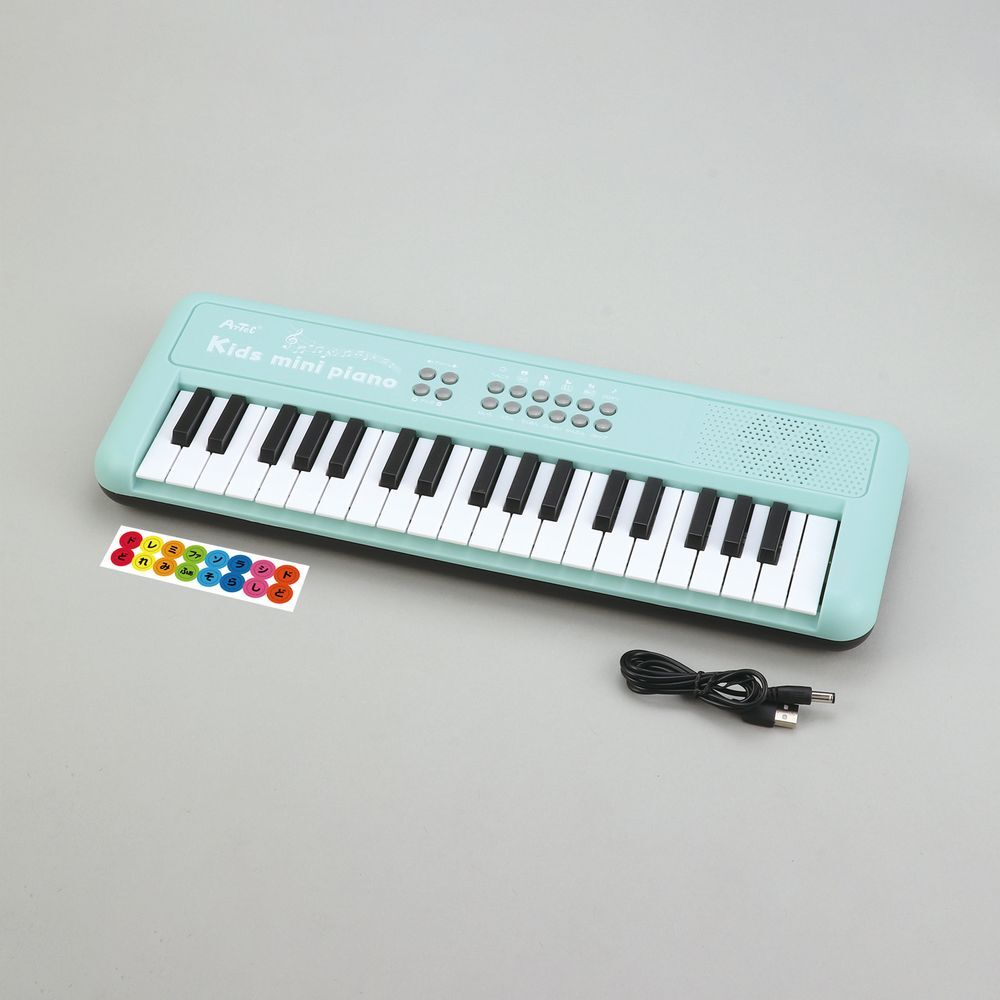 かわいいパステルカラーのキッズピアノです。37鍵盤。音量は16段階調節可能。単三電池4本使用(USB給電も可能)。白鍵に貼ってまなべるドレミシール付!対象年齢:6歳以上。●自動演奏(8曲):「きらきら星」や「カノン」など8曲を自動再生します。(楽曲一覧:きらきら星、フレール・ジャック、メリーさんのひつじ、ゆかいな牧場、ちょうちょ、エリーゼのために、トルコ行進曲、カノン)●なりきり演奏:楽曲を選択すると、伴奏が流れます。鍵盤を押すだけで、ピアニストになりきって楽曲の演奏ができます。楽曲は自動演奏の8曲と同じになります。●打楽器・どうぶつの鳴き声(各4種):打楽器音、動物鳴き声各4種 に切り替えできます。●鍵盤の音色(8種):ピアノ、ギター、トランペットなど8種の音色に変換できます。(音色一覧:ピアノ、木琴、オルガン、ギター、バイオリン、ハープ、トランペット、クラリネット)●リズムパターン16種:ロック、レゲエ、サンバなど16のリズムに変換できます。●演奏を録音(~150音まで)&再生:鍵盤音、打楽器/動物の鳴き声を録音できます。