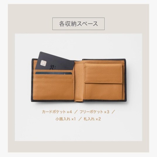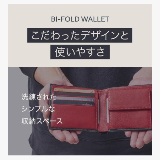 【こだわりの本革二つ折り財布】ズボンの後ろポケットやジャケットの内ポケットに入れることが多い二つ折り財布だからこそ、丈夫で型くずれしにくい上質な本革を使用しております。