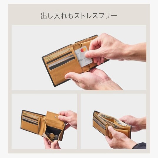 【こだわりの使いやすさ】小銭入れはガバっと開き中が見やすく取り出しやすい設計。札入れには仕切りがあるのでレシートなども分けて収納可能です。カード入れ部分は幅・深さなど数ミリ単位でこだわり出し入れのしやすさを徹底的に追求しました。