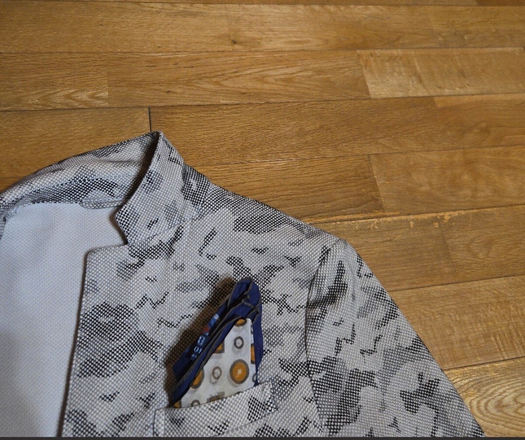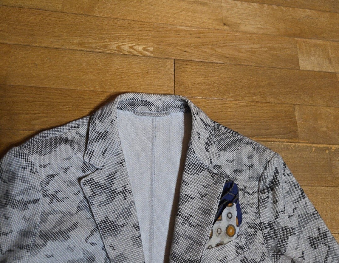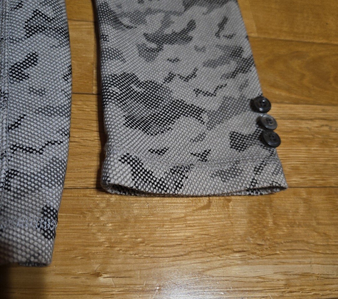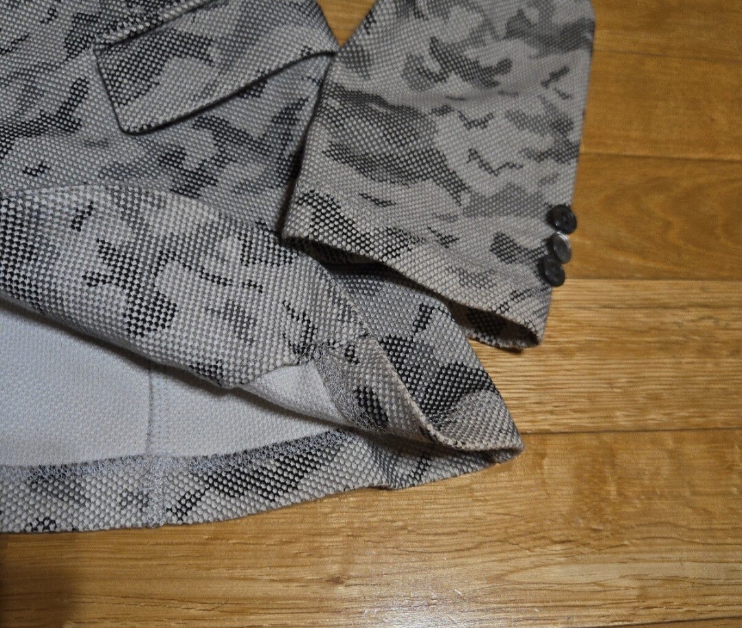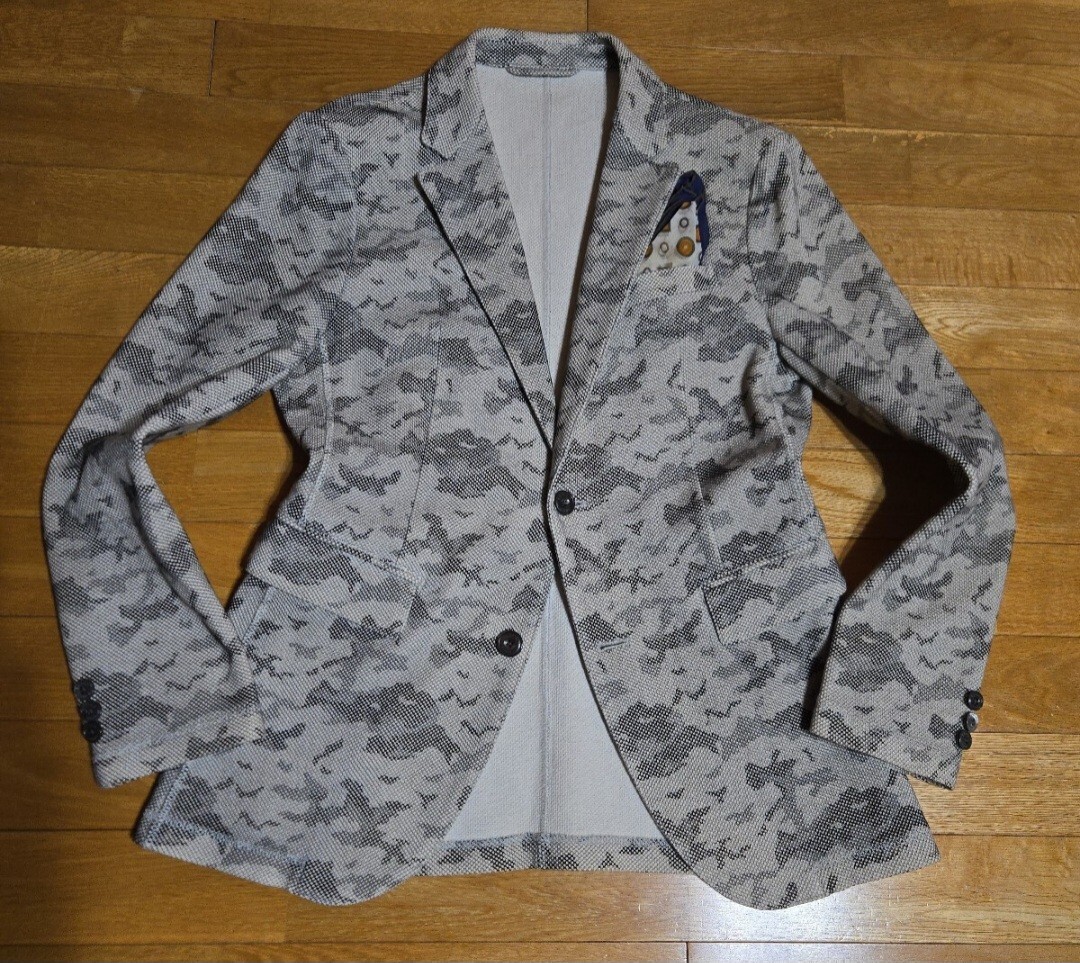 生地は柔らかな着心地が良い、爽やかでさらっとした上質なやや通年素材の風合いが特徴の素材感。上品な印象のジャケットでお勧めです。細身のスタイリッシュなデザインながらも、軽い着心地で、ラフにカジュアルスタイルにも、カチッとしたオンスタイルにも使用して頂けます。 シルエットはシャープでスマートなシルエットで、素材感のお色もこれからの時期に活躍します良質トレンド素材の上品なエンボス調カモフラ柄グレー、裏地はアンコン仕立てで春夏秋に着用して頂けます。