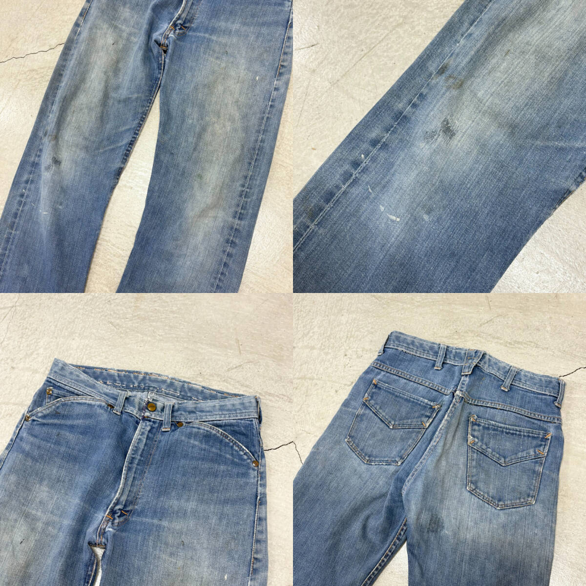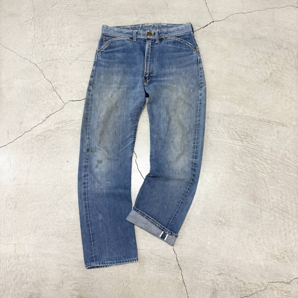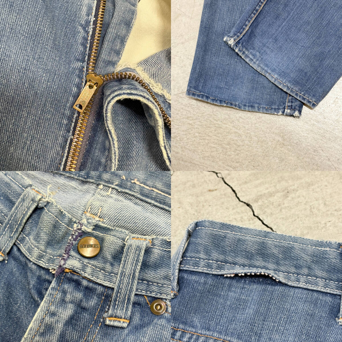 | * 商品説明 * ■ 今回ご紹介するお品は、50s 60s ROEBUCKS ローバックス フリスコ 耳付き デニム ジーンズ ビンテージ /CRになります。 ■ ローバックスのフリスコデニムです。50、60年代。ジッパーはグリッパー。 ■ サイズ 不明 実寸平置き計測 ウエスト約80cm レングス 約72cm 総丈 約99cm 裾幅約20cmになります。 素人寸法ですので、誤差はご了承くださいませ。 ■ 状態 使用感あります。ヒップ付近、膝、バックポケット角にリペア、裾、ウエスト、ポケット縁等ににスレ、ウエスト、ヒップ、裾等にステッチの抜け、太もも、膝、膝裏に汚れがあります。神経質な方はご入札をお控えください。画像参照。 | ||||||||