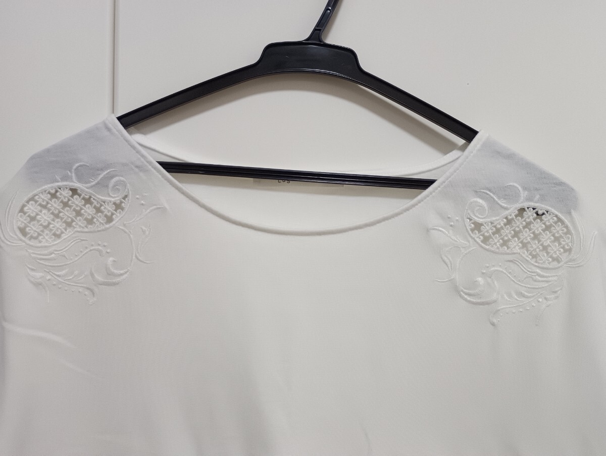 美品 ルノンキュール 白色 刺繍 Tシャツです。フリーMです。サイズは着丈約54cm、身幅約59cmです。