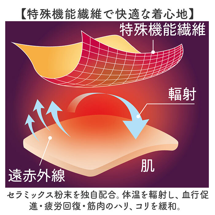 商品説明 | ・・【お休みタイムに疲れをリカバリー】 ・着る疲労回復◎アクティブな毎日へ!「リカバリーケアレディースロングパンツ」。 ・【特殊機能繊維で快適な着心地】 ・セラミックス粉末を独自配合。体温を輻射し、血行促進・疲労回復・筋肉のハリ、コリを緩和。 ・【サラリとした質感でストレスフリー】 ・肌当たりが優しい、ポリエステル&コットン混紡素材。チクチク感もなく、睡眠を妨げない◎ ・【リラックス時間の着用がおすすめ】 ・就寝時や、ホッと一息つく時間に着用。肌寒い季節や冷房対策にもぴったりな、ロング丈。 ・【締め付けず、自分サイズにフィット】 ・ウエストゴム仕様で調節自在、軽やかに履けるパンツ。左右にポケット付き。 ・【機能面はそのままに、丸洗いOK】 ・ネットに入れて、洗濯機洗い可能。洗濯しても機能はそのまま、いつも清潔をキープ。 ・(※)洗濯機の弱モードをご使用ください。繊維自体に練り込まれているため、繰り返し洗濯しても機能を発揮します。 ・【頑張っている方へのギフトにも】 ・忙しい時こそ、しっかり休息が必要◎心地よい睡眠をサポートし、目覚めもすっきり。 |