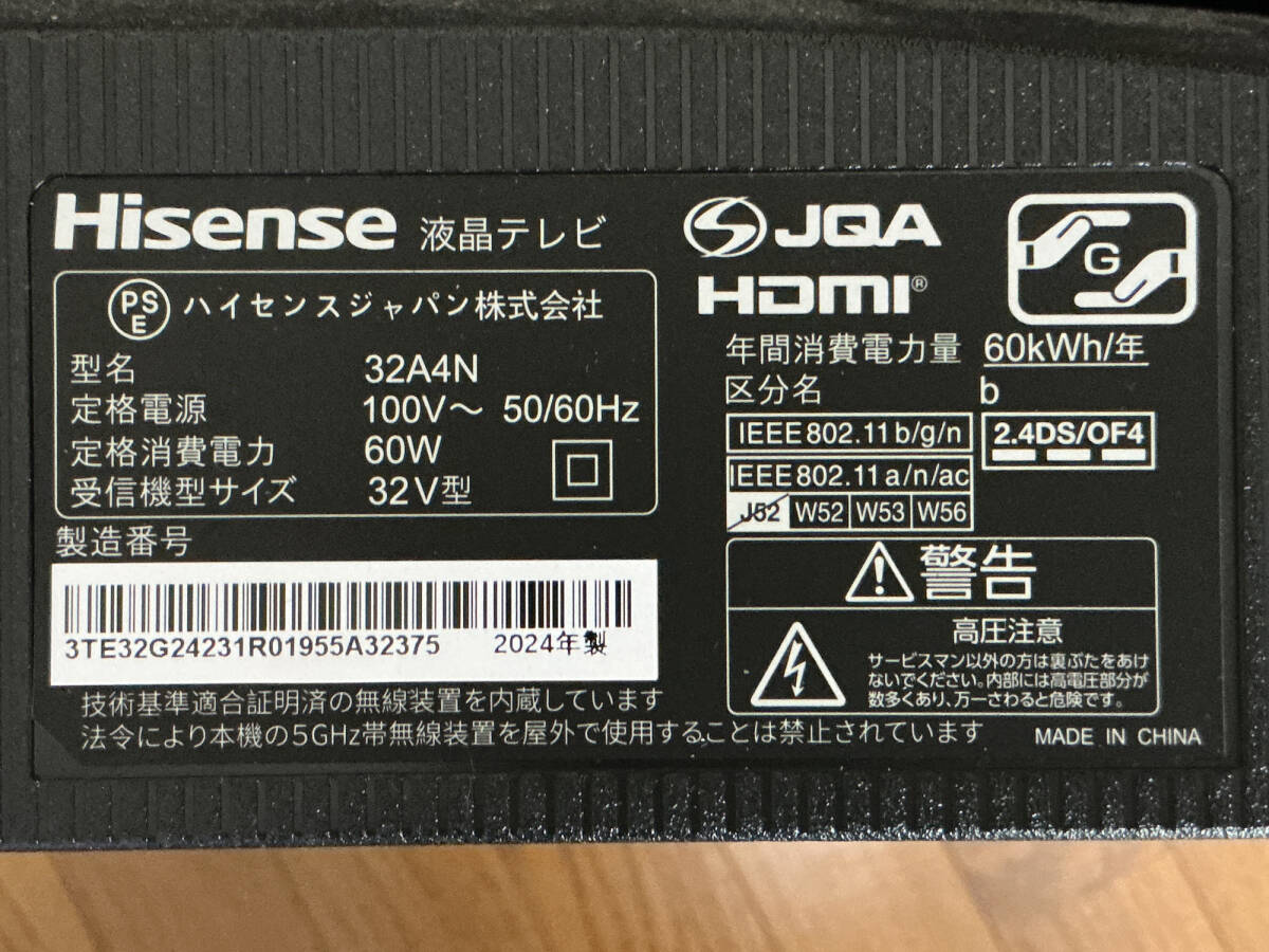 ジャンク品 ハイセンス 32A4N 32V型 2024年製 フルHD 液晶テレビ B-CASカード Hisense(液晶割れ 部品取り用)、