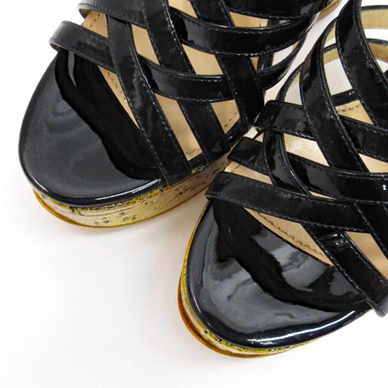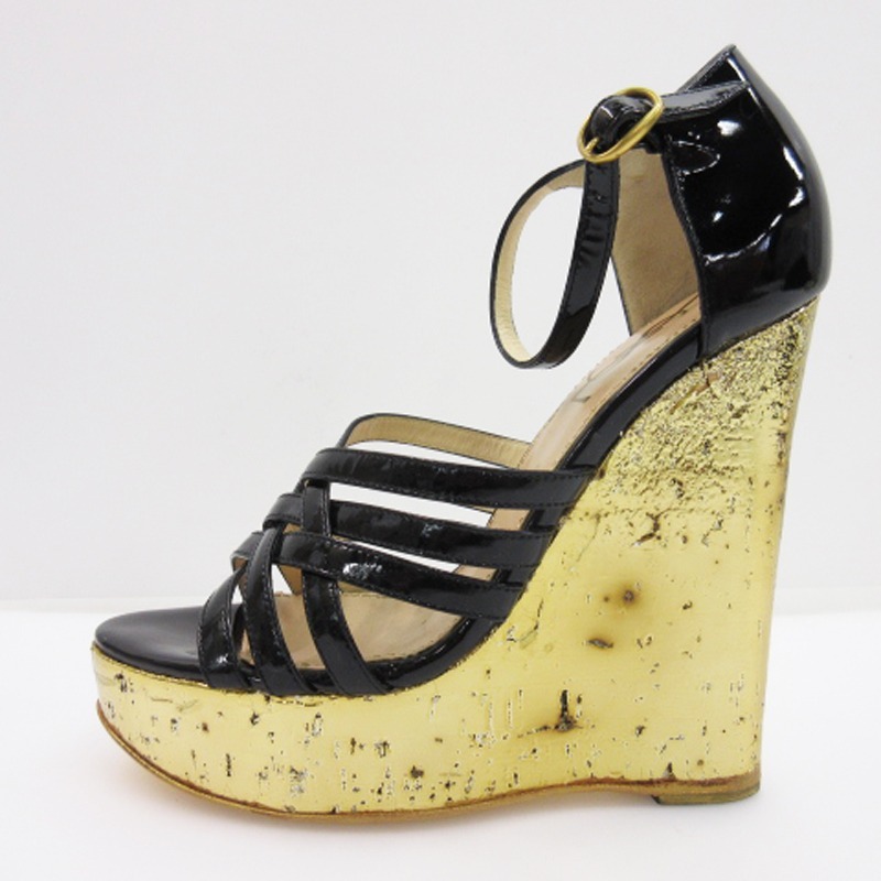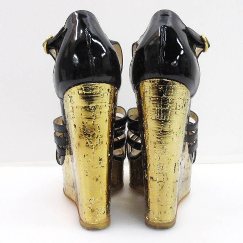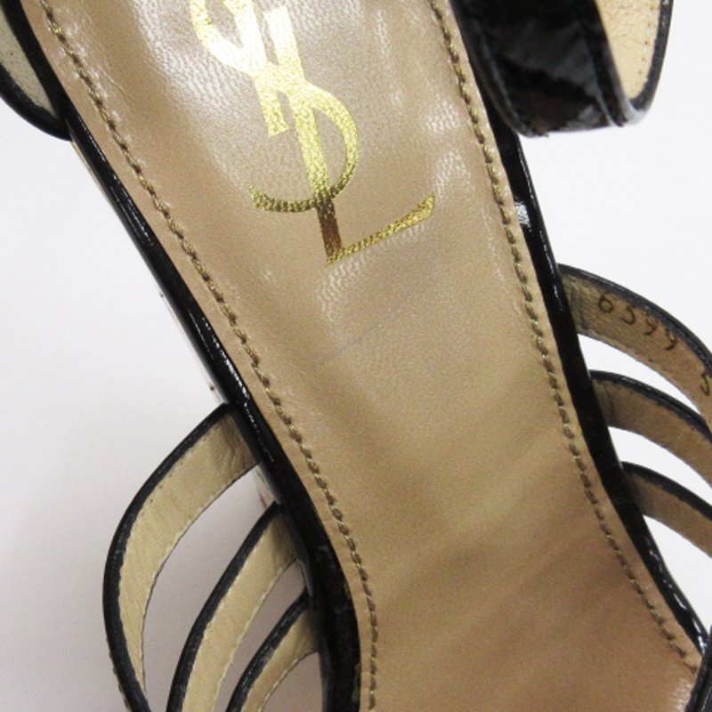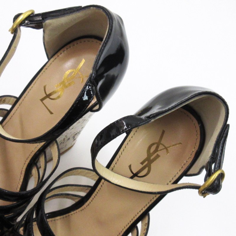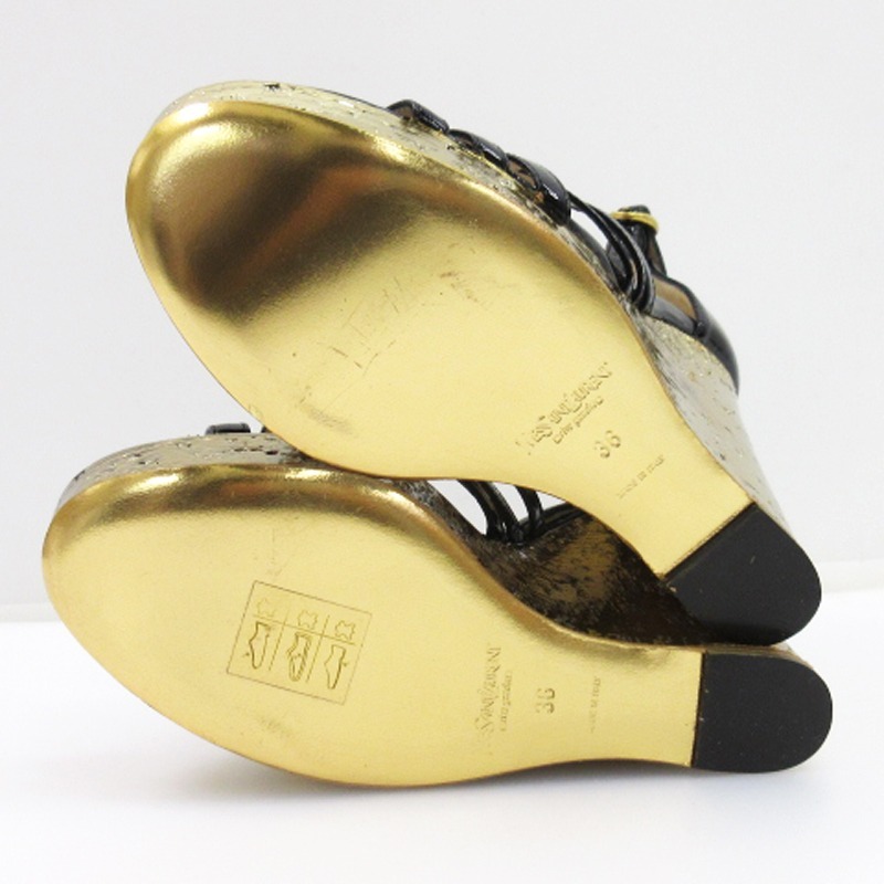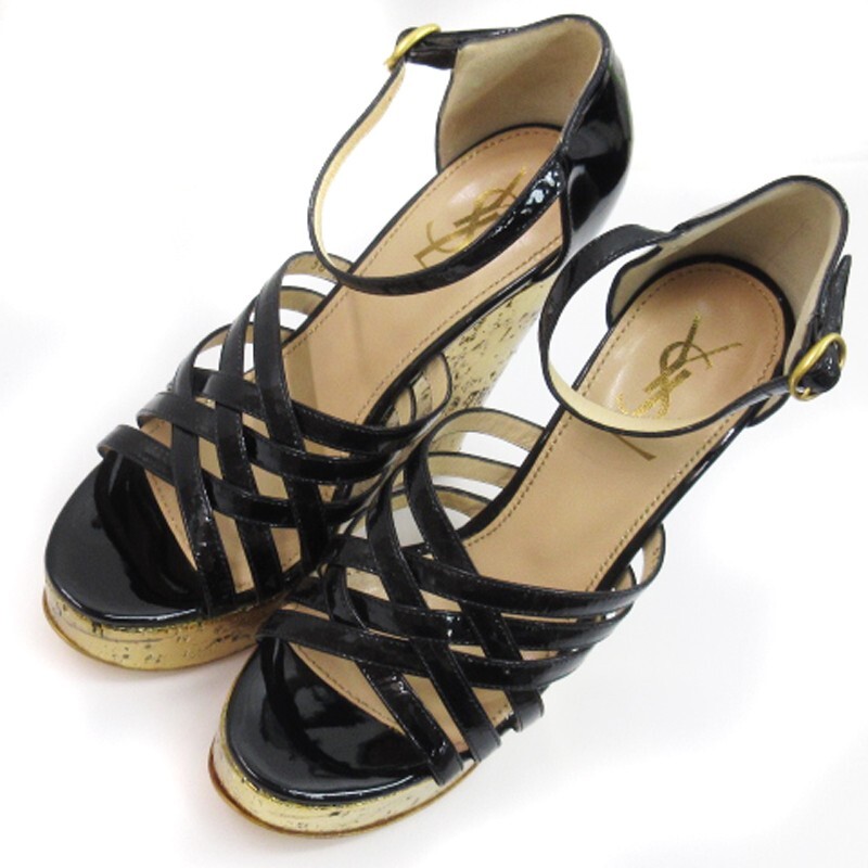イヴサンローランリヴゴーシュ YVES SAINT LAURENT rive gauche ストラップ サンダル ウェッジソール エナメル ブラック ゴールドカラー 36 23cm レディース