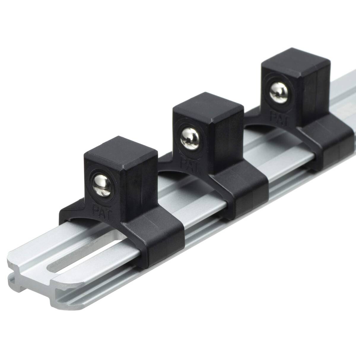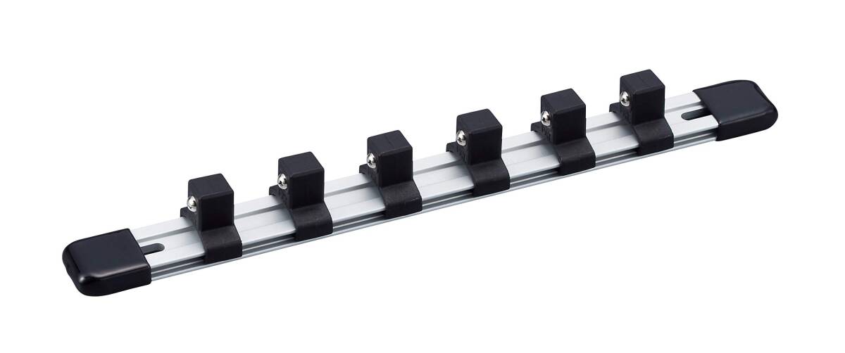 ソケット、ジョイント類をスッキリ整理可能。 グリップは樹脂製(鋼球付)でソケットの取り外しが容易。 ソケットを装着したままレール上をスライド可能。 ねじ穴付きで壁掛けやデスク固定が可能。