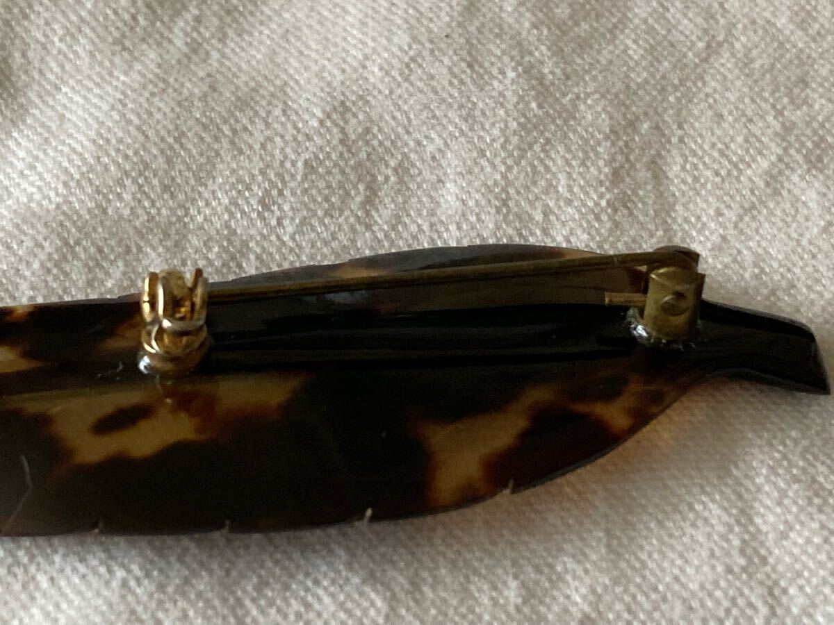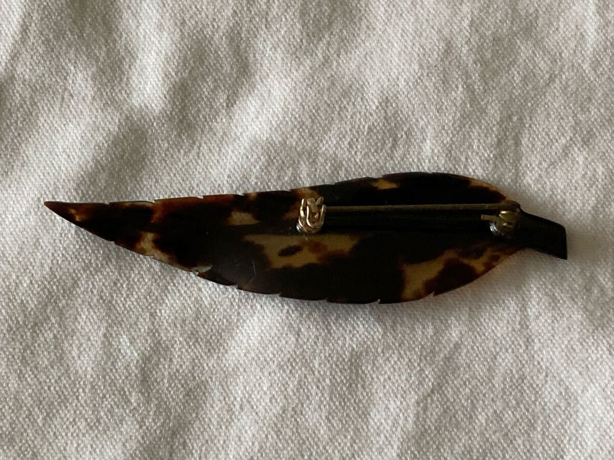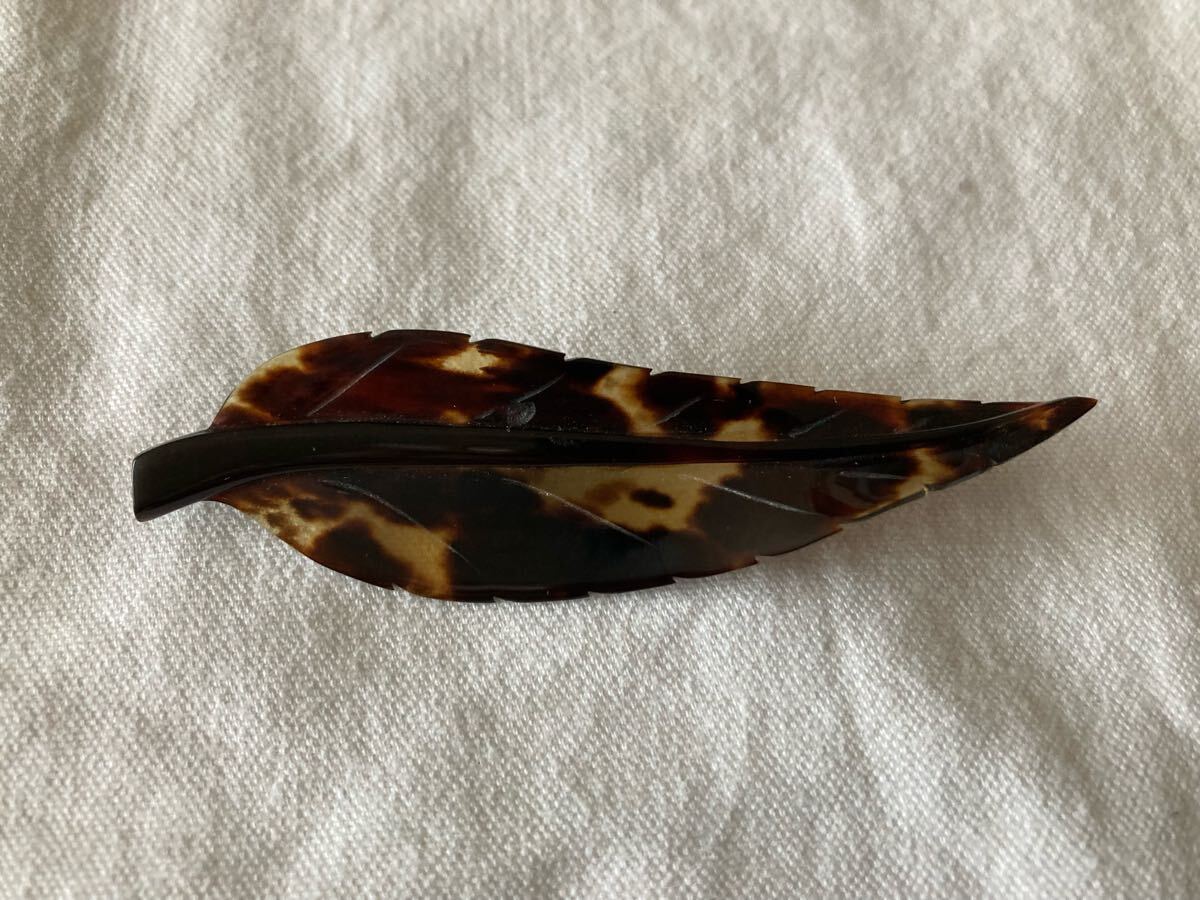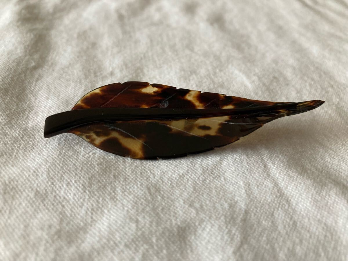 葉の形状のブローチ、茶色と黒の模様が特徴。