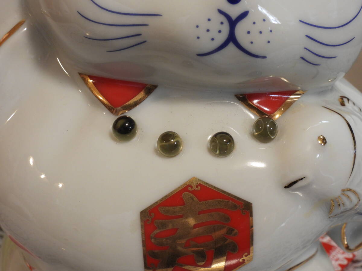 左手を上げた招き猫の手に水晶が1個・襟元に4個付いています。