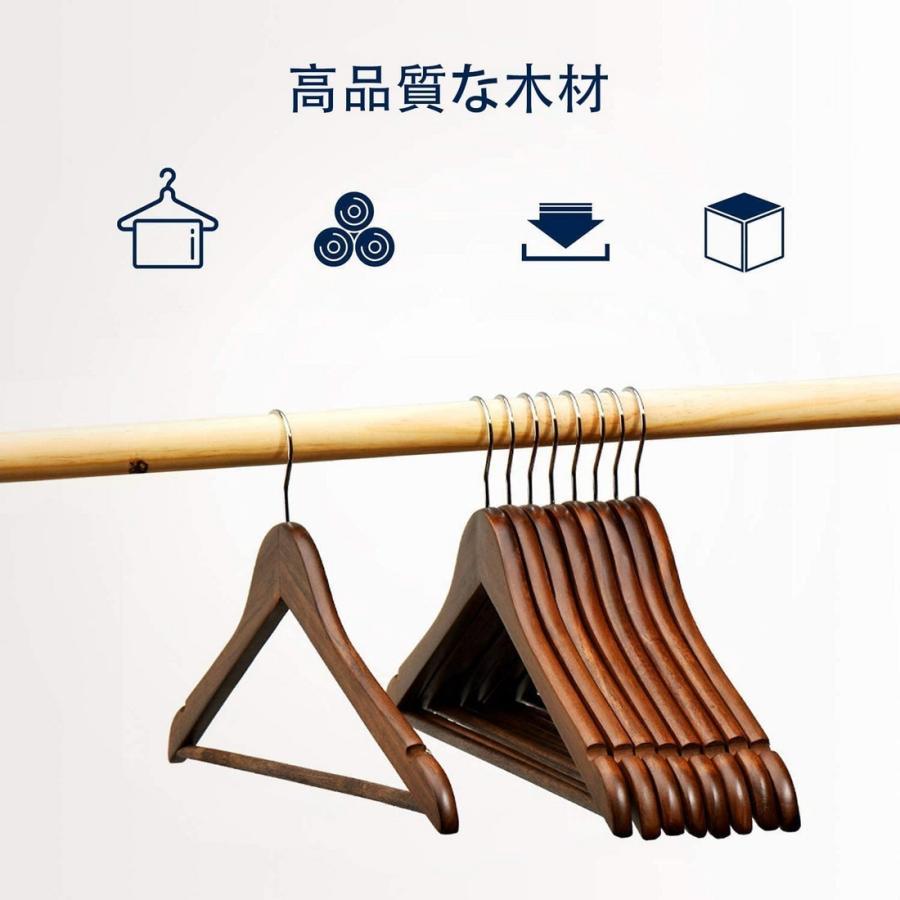 高級な天然木で作られており、木目が綺麗で高級感があります。耐久性にも優れていて、重いコート、スーツもOK。肩のラインがなだらかに設計されており、衣類が型崩れしにくくなっています。