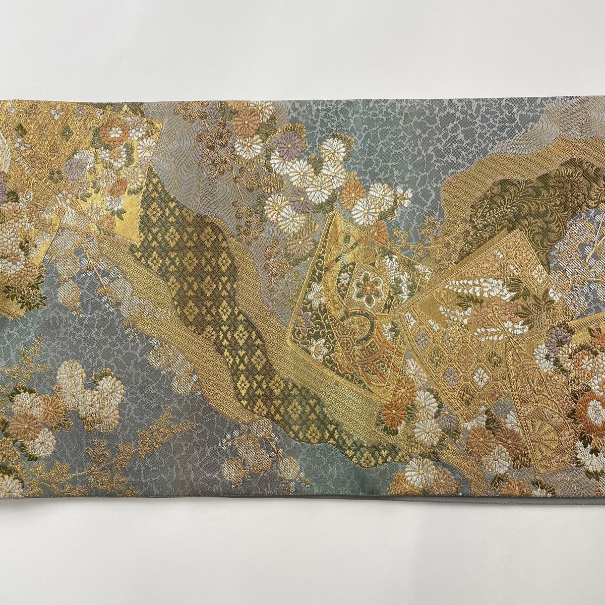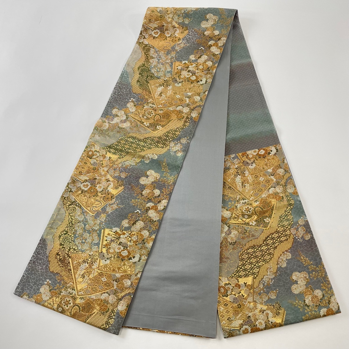 | 袋帯 美品 秀品 冊子 秋草 金糸 刺繍 青灰色 六通 正絹 【中古】 |
