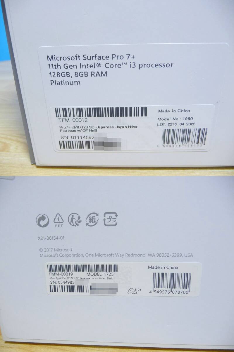 | 商品説明 | マイクロソフト Microsoft Surface Pro 7+ (サーフェス プロ 7 プラス)TFM-00012 + 純正キーボード FMM-00019 [12.3インチ/Core i3-1115G4/メモリ 8GB/SSD 128GB/ Windows 11 Home/Office Home & Business 2021/プラチナ] です。 Surface Pro 7+ (サーフェス プロ 7 プラス)TFM-00012と Surface Pro用 タイプカバー ブラック FMM-00019【純正】 のセットでの出品になります。 ともに国内大手家電量販店(正規販売代理店)購入の展示品です。 TFM-00012のメーカー保証書未記入に店舗保証書(販売店保証明細)付属。 (FMM-00019の方は2024年購入ですので保証明細なしです。 お付けすることはできますが、こちらは1年保証期間経過しております) 即決です。消費税はかかりません。 2025年8月下旬から1年保証付。1点限りになります。 後述のTypeAとTypeCにも対応したUSBメモリ、おまけで付属します。 外観状態、タブレット本体は液晶面キレイ、外観美品と思います。 キーボード本体は普通の展示品だと思います。 展示品されていた際の小キズ、スレ、汚れ、 主観の差はご容赦下さい。画像をご参考にして下さい。 2025年8月下旬の購入前に購入店の方でリカバリ (=PC初期化、リセット)してもらっております。 2025年9月現在で最新のバージョン、Windows11の24H2になっております。 また私の方でも出品前にキーボードと繋げて(マグネット式の着脱なので秒でできます) デスクトップ画面まで簡易動作確認として画面出し その後、再度リカバリしております。(動作OK) 紐づけされないようMicrosoftアカウントは設定しておりません。 ノータッチ、購入した時の状態のままです。 (紐づけされてOfficeが使えなくなったらまずいので…) インターネットに繋がずデスクトップまではローカルアカウントで進んでおります。 付属品は全部揃っています。 購入後は上述の動作確認を除き未使用です。 ◆同梱品⇒全部揃っているのを確認しております。 (箱裏の同梱品欄より) /マイクロソフト Microsoft Surface Pro 7+ TFM-00012 本体 /マイクロソフト Surface Pro タイプ カバー FMM-00019 (カバータイプキーボードFMM-00019のお手入れと使用上の注意冊子 とメーカー保証書冊子) /電源アダプター(と電源ケーブル) /Office Home & Business 2021 (プロダクトキーパッケージ未開封) と /Microsoft Surface Pro 7+ スタートガイド(始めましょう~) /PCリサイクルシールのシート /メーカー保証書冊子(未記入) と [おまけ] /USBメモリ32GB(TypeA&TypeC端子搭載機種)(新品) ◆製品 ポータブル「Windowsタブレット」 タブレットでもノートパソコンとしても使える 2 in 1 クラシックなPro「Surface Pro 7+」 ■優れたパフォーマンスで快適に使える 第11世代 Intel Core i3 プロセッサーを搭載し、 最大約15時間の長時間バッテリーに加えて急速充電にも対応。 どこにいても、自由にパフォーマンスを発揮できます。 紙のように書ける4,096段階の筆圧と傾きを検知するSurfaceペンにも対応し、 メモやアイデアを簡単に書き込むことができます。 ※Surface ペンは別売りです。 ■毎日の使いやすさを追求 USB Type-AとUSB Type-C搭載で様々な周辺機器とお使いいただけます。 また、Dual far-field スタジオ マイクにより、 オンライン会議や電話でもさらにクリアで聞き取りやすい音声を実現しました。 Dolby Atmos対応スピーカーで動画視聴も快適です。 ■お求めやすい Surface Pro Windows11とOffice 2021搭載のお求めやすいSurface Pro。 片手で持ててA4サイズのバッグにもすっぽり収まる薄さ8.5mm、軽さ約770g。 パワフルなノートPCとしても、薄型軽量のタブレットとしても、 バランスよく快適に使用できます。 キックスタンドでディスプレイ部分を好きな角度に調整できるから、 場所を選ばず使いこなせます。 【仕様】 【マイクロソフト Surface Pro タイプ カバー FMM-00019】 (Proシリーズ 3~7に対応) 【マイクロソフト Surface Pro 7+ (サーフェス プロ 7 プラス)TFM-00012】 ●OS :Windows 11 Home 64ビット ●CPU:第11世代 Intel Core i3-1115G4 ●メモリ :8GB ●ストレージ :SSD 128GB ●表示機能: ・12.3インチ PixelSense Display ・画面解像度: 2736x1824 ・タッチパネル:搭載 10点マルチタッチ対応 ●オーディオ:Dual far-field スタジオ マイク内臓、 Dolby Atmos搭載 1.6W ステレオスピーカー ●Webカメラ: ・前面カメラ画素数:5メガピクセル 1080p対応 ・背面カメラ画素数:8メガピクセル 1080p オートフォーカス付 ●顔認証:あり ●セキュリティ:エンタープライズレベルのセキュリティ、 Firmware TPM、Windows Hello 顔認証サインインによる エンタープライズレベルのセキュリティ、Windows拡張ハードウェア セキュリティ ●無線LAN :Wi-Fi 6= 802.11a/b/g/n/ac/ax ●Bluetooth :5.0対応 ●カードスロット :あり ●外部接続端子:USB-C、フルサイズUSB-A、 microSDXCカードスロット、 3.5mmヘッドセットジャック、 SurfaceConnect (充電、 Surface ドック用端子)、 Surface Dial のオフスクリーン操作に対応 ●本体サイズ: 幅 292mm x高さ 8.5mm x奥行き 201mm ●質量:0.77kg ●Officeソフト :Microsoft Office Home & Business 2021付属 ●主な付属品 :電源アダプター、クイック スタート ガイド、 Office Home and Business 2021初回インストール用プ