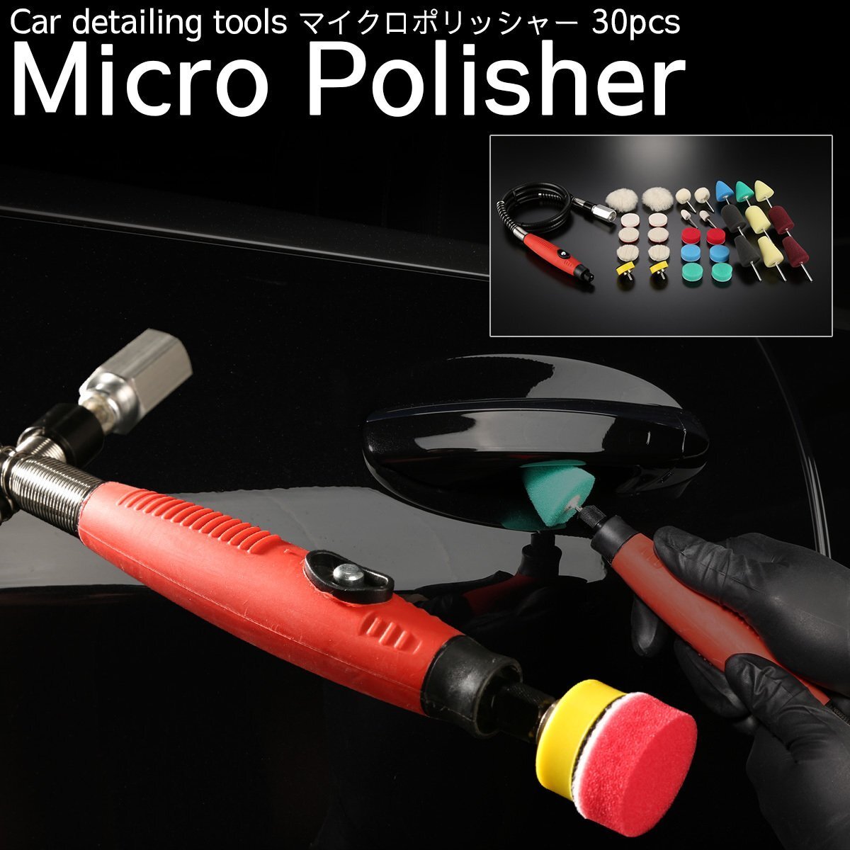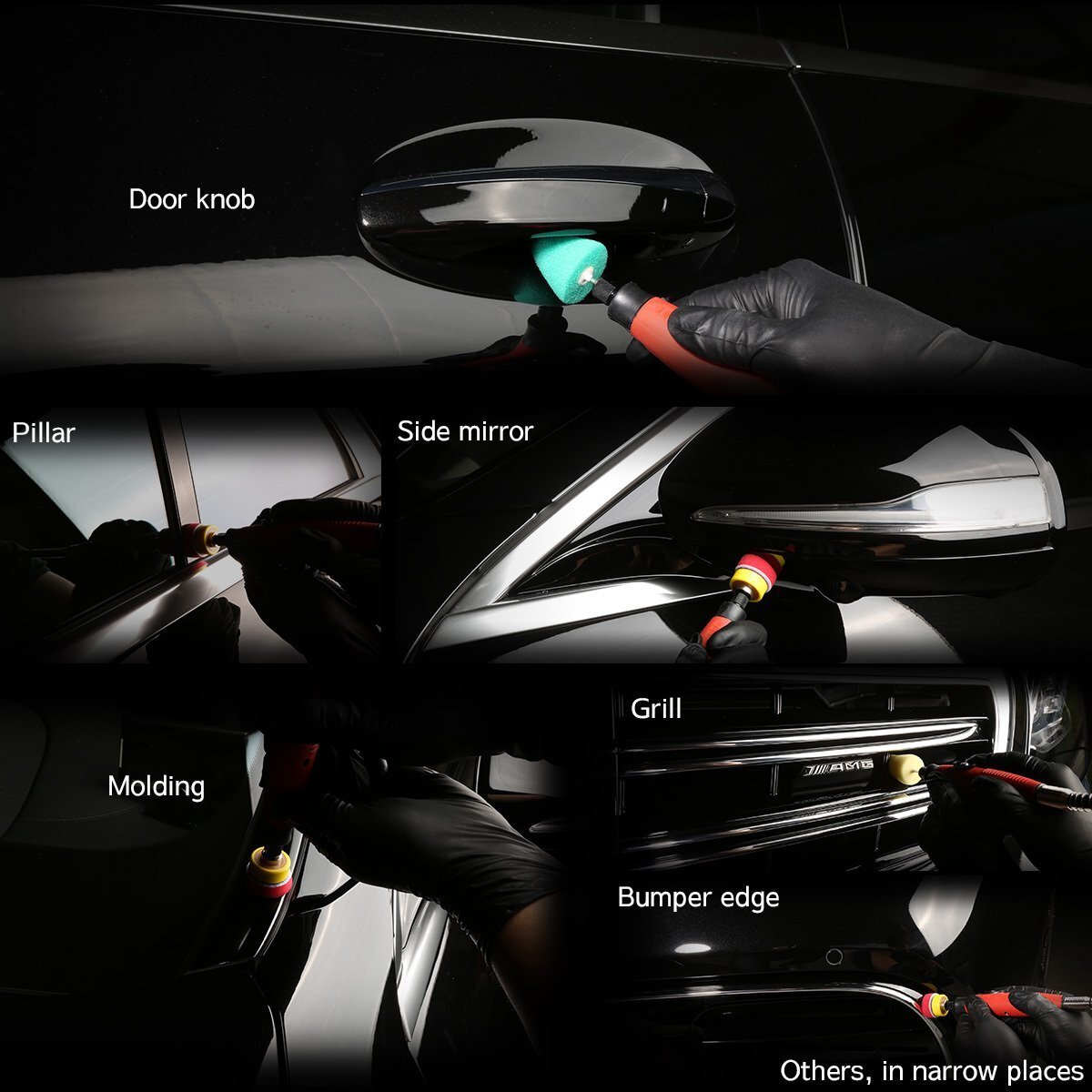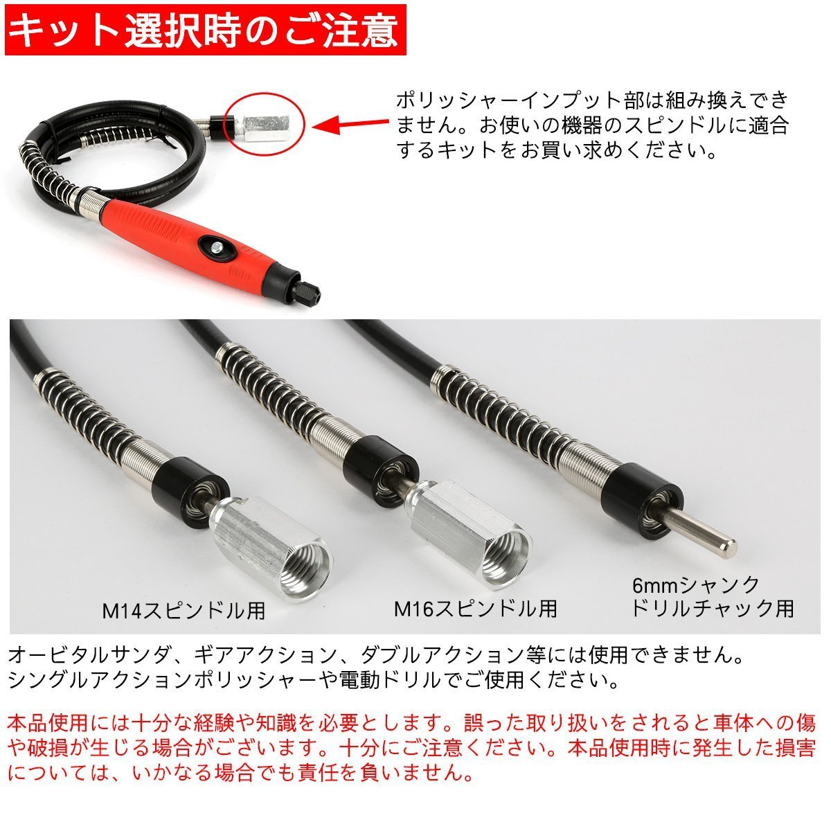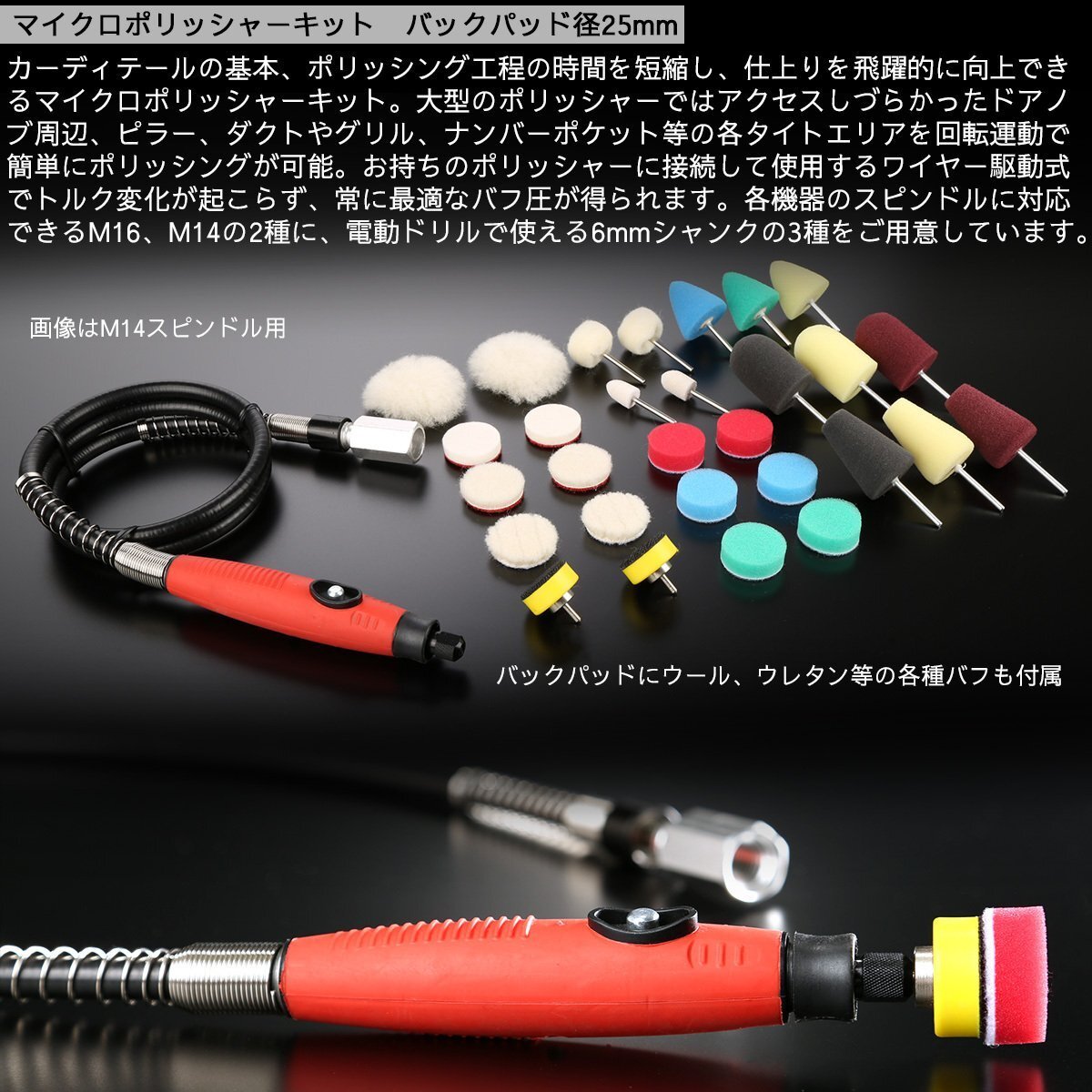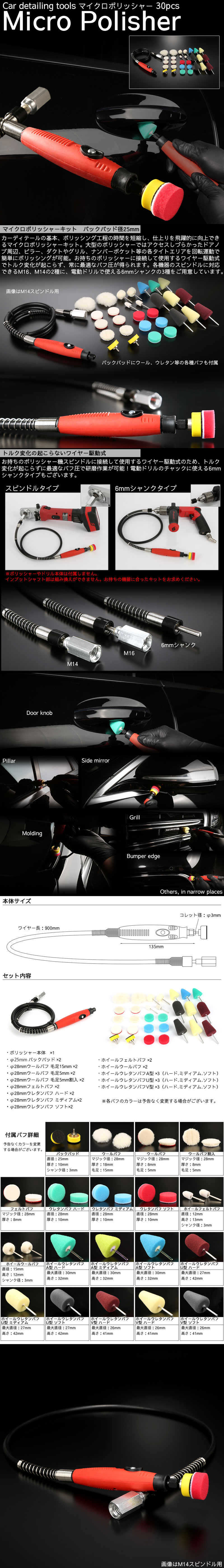 カーディテールの基本、ポリッシング工程の時間を短縮し、仕上りを飛躍的に向上できるマイクロポリッシャーキット。 大型のポリッシャーではアクセスしづらかったドアノブ周辺、ピラー、ダクトやグリル、ナンバーポケット等の各タイトエリアを回転運動で簡単にポリッシングが可能。 お持ちのポリッシャーに接続して使用するワイヤー駆動式でトルク変化が起こらず、常に最適なバフ圧が得られます。 各機器のスピンドルに対応できるM16、M14の2種に、電動ドリルで使える6mmシャンクの3種をご用意しています。 ※ポリッシャーやドリル本体は付属しません。インプットシャフト部は組み換えができません。お持ちの機器に合ったキットをお求めください。 | ■ マイクロポリッシャーキット ■ 対応スピンドル:M14 ■ コレット径:Φ3mm ■ バックパッド径:Φ25mm ■ 各種バフ付き30点セット ■その他のスピンドル用は⇒ こちら ■各種バフ・消耗品は⇒ こちら ※本品使用には十分な経験や知識を必要とします。誤った取り扱いをされると車体への傷や破損が生じる場合がございます。十分にご注意ください。本品使用時に発生した損害については、いかなる場合でも責任を負いません。 | |